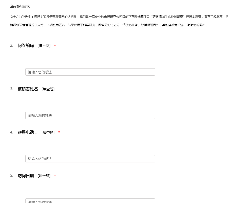 女士/小姐/先生:您好!我是伍壹调查网的访问员,我们是一家专业的市场研究公司目前正在围绕着项目“跨界流域生态补偿调查”开展本调查,旨在了解北京、河北公众对永定河-洋河流域生态补偿的了解,为跨界水环境管理提供支持。本调查为匿名,结果仅用于科学研究,回答无对错之分,请放心作答。除指明题目外,其他全部为单选。 谢谢您的配合。
