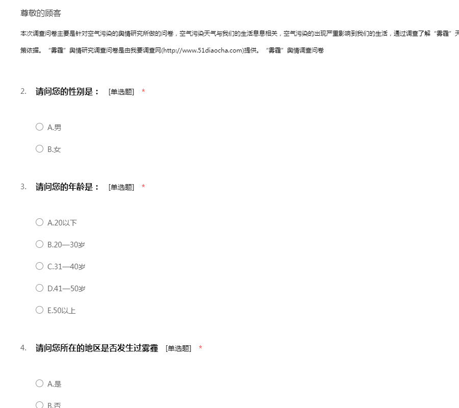 本次调查问卷主要是针对空气污染的舆情研究所做的问卷,空气污染天气与我们的生活息息相关,空气污染的出现严重影响到我们的生活,通过调查了解“雾霾”天气的在线公共意见,进而为网络舆情引导提供决策依据。“雾霾”舆情研究调查问卷是由我要调查网(http://www.51diaocha.com)提供。“雾霾”舆情调查问卷