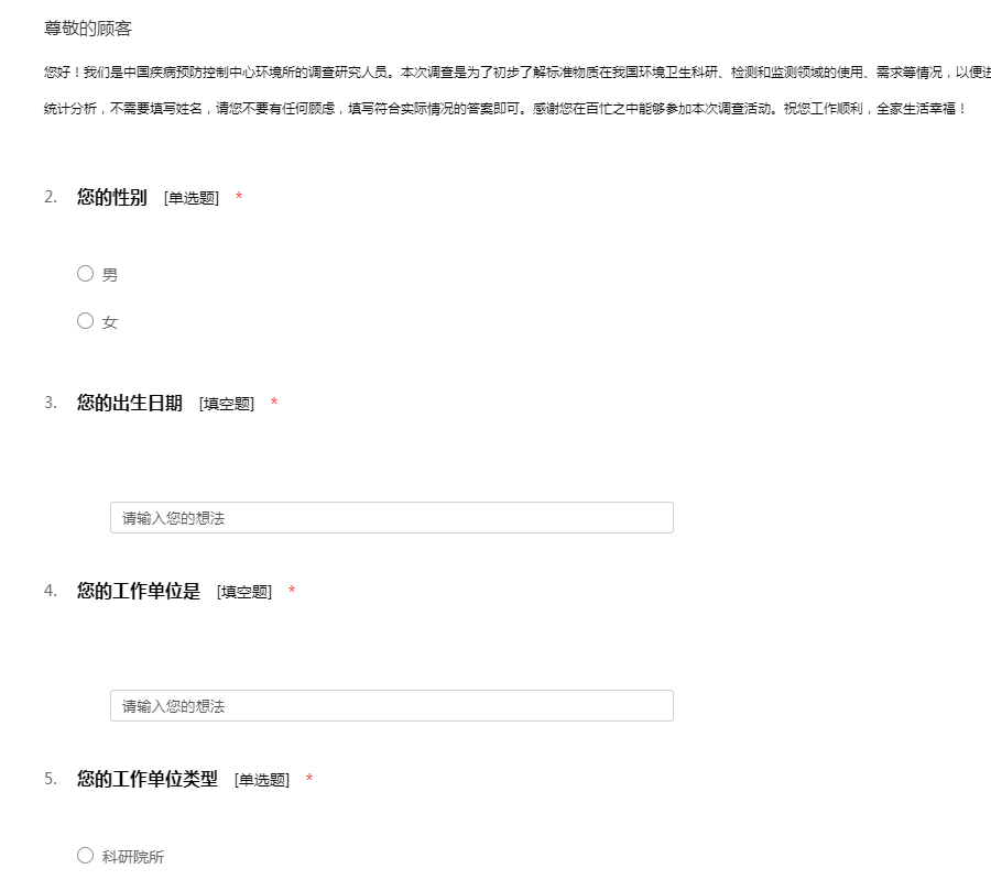 您好!我们是中国疾病预防控制中心环境所的调查研究人员。本次调查是为了初步了解标准物质在我国环境卫生科研、检测和监测领域的使用、需求等情况,以便进一步做好标准物质的研制工作。本次调查只用来统计分析,不需要填写姓名,请您不要有任何顾虑,填写符合实际情况的答案即可。感谢您在百忙之中能够参加本次调查活动。祝您工作顺利,全家生活幸福!