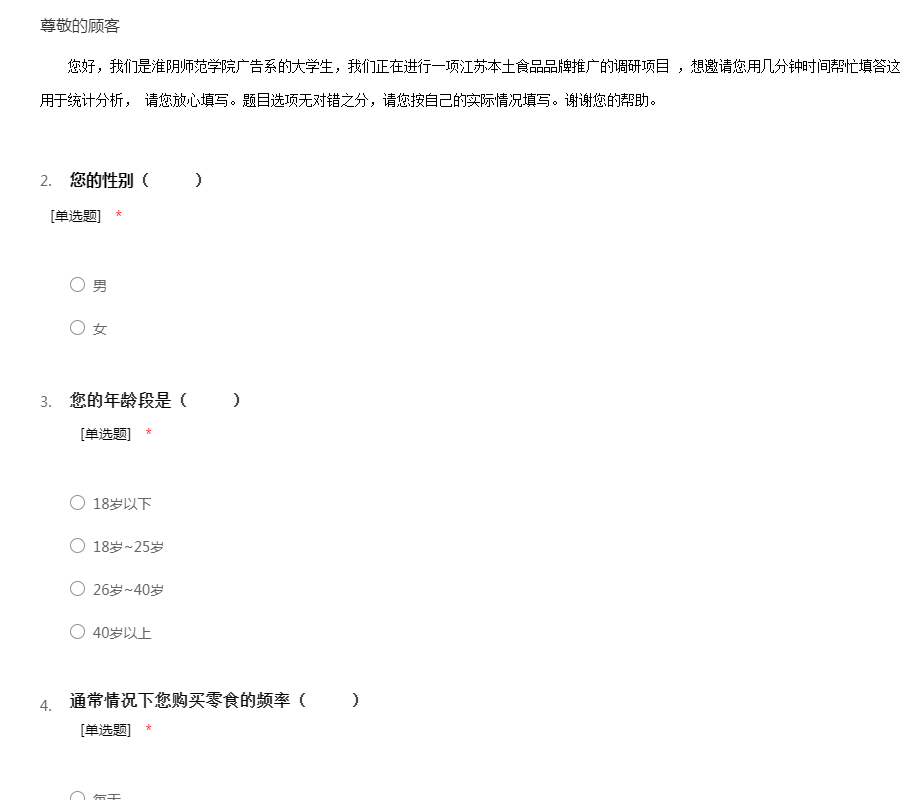 您好,我们是淮阴师范学院广告系的大学生,我们正在进行一项江苏本土食品品牌推广的调研项目 ,想邀请您用几分钟时间帮忙填答这份问卷。本问卷实行匿名制,所有数据只用于统计分析, 请您放心填写。题目选项无对错之分,请您按自己的实际情况填写。谢谢您的帮助。