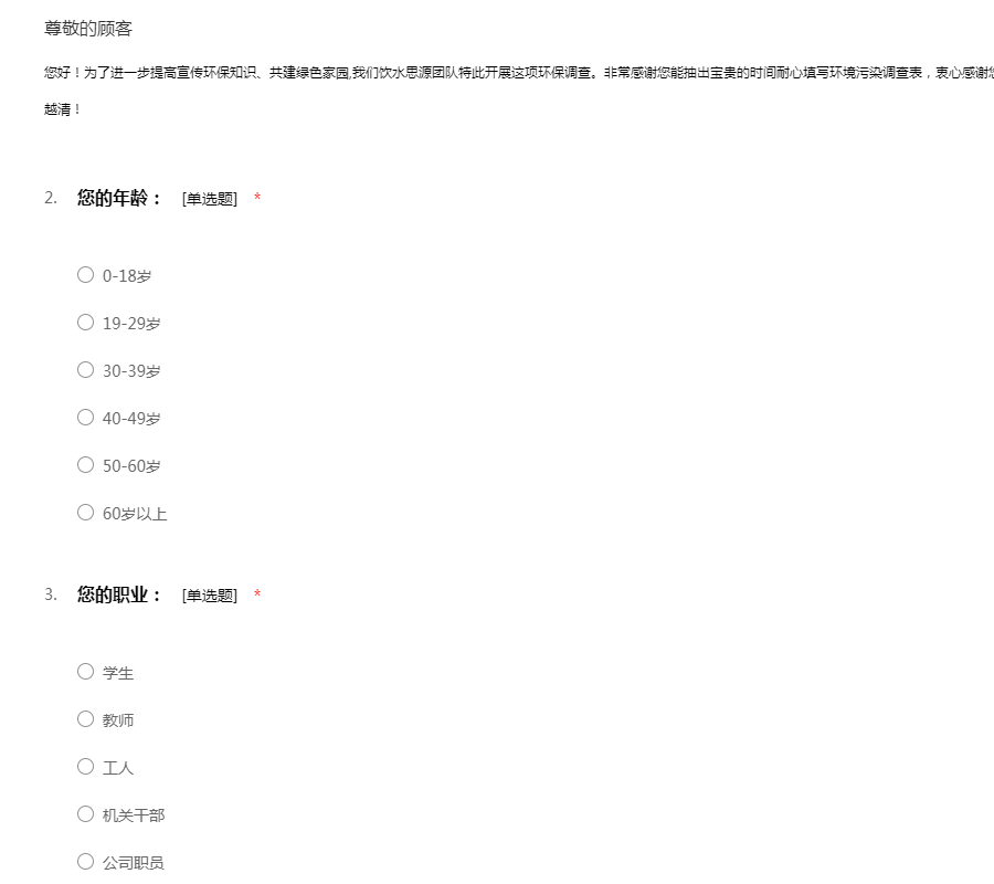 您好!为了进一步提高宣传环保知识、共建绿色家园,我们践行者团队特此开展这项环保调查。非常感谢您能抽出宝贵的时间耐心填写环境污染调查表,衷心感谢您的支持与合作!希望我们的天越来越蓝,水越来越清!