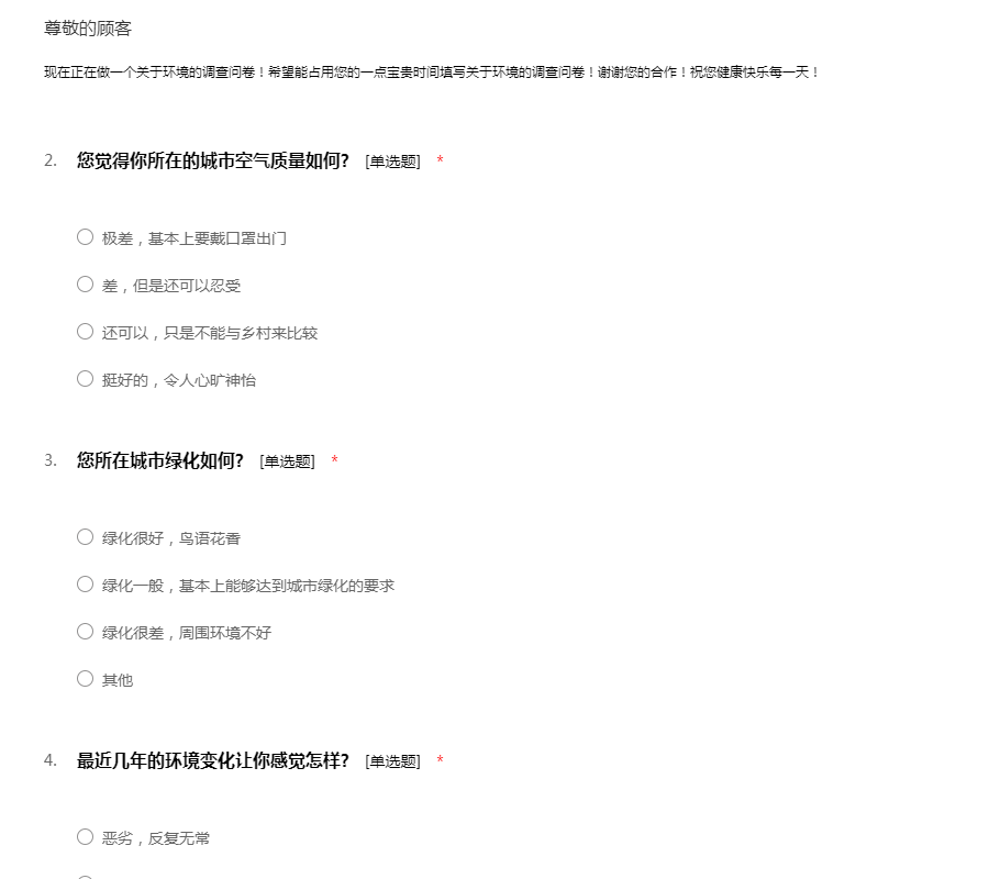 现在正在做一个关于环境的调查问卷!希望能占用您的一点宝贵时间填写关于环境的调查问卷!谢谢您的合作!祝您健康快乐每一天!