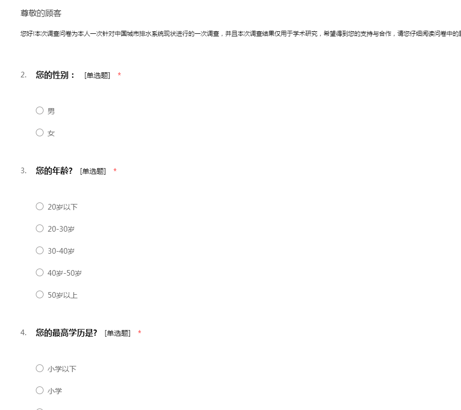 您好!本次调查问卷为本人一次针对中国城市排水系统现状进行的一次调查,并且本次调查结果仅用于学术研究,希望得到您的支持与合作,请您仔细阅读问卷中的题目,并认真作答,在此深表谢意!