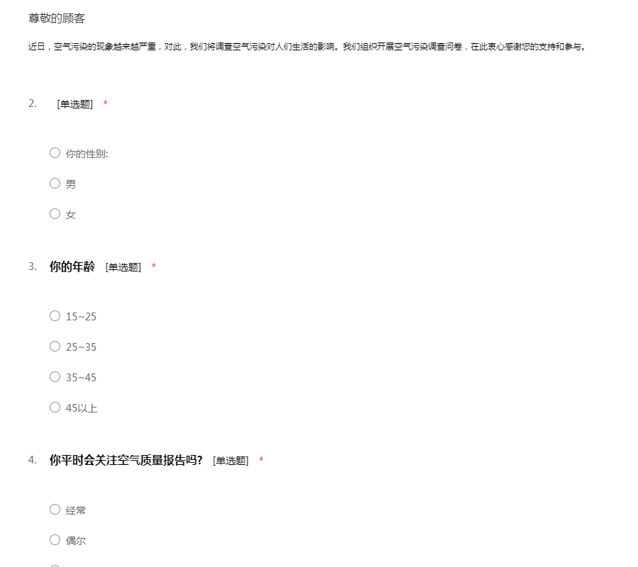 近日,空气污染的现象越来越严重,对此,我们将调查空气污染对人们生活的影响。我们组织开展空气污染调查问卷,在此衷心感谢您的支持和参与。