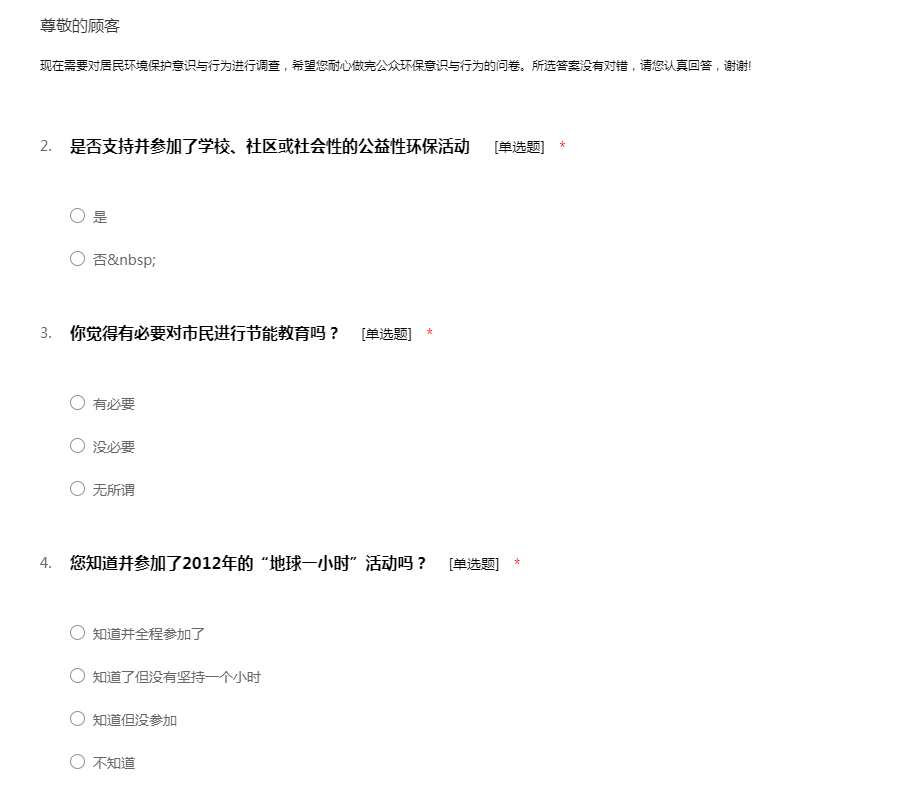 现在做关于低碳环保调查表,感谢您从百忙中抽出时间来支持我们!请如实填写关于低碳环保调查表。调查采用匿名方式。谢谢您的合作!