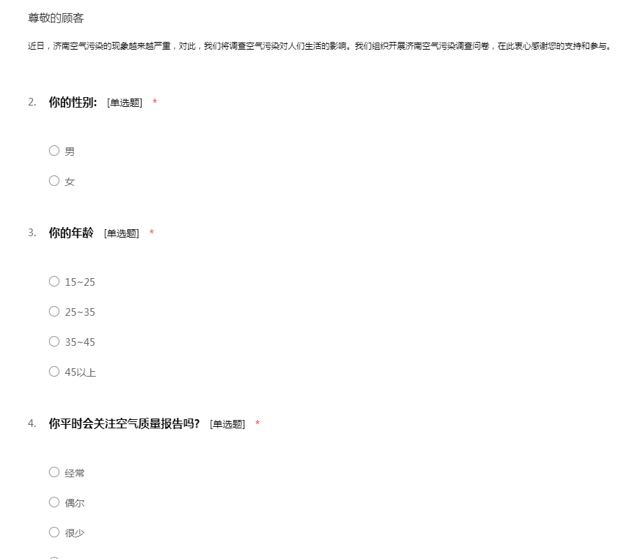 近日,济南空气污染的现象越来越严重,对此,我们将调查空气污染对人们生活的影响。我们组织开展济南空气污染调查问卷,在此衷心感谢您的支持和参与。