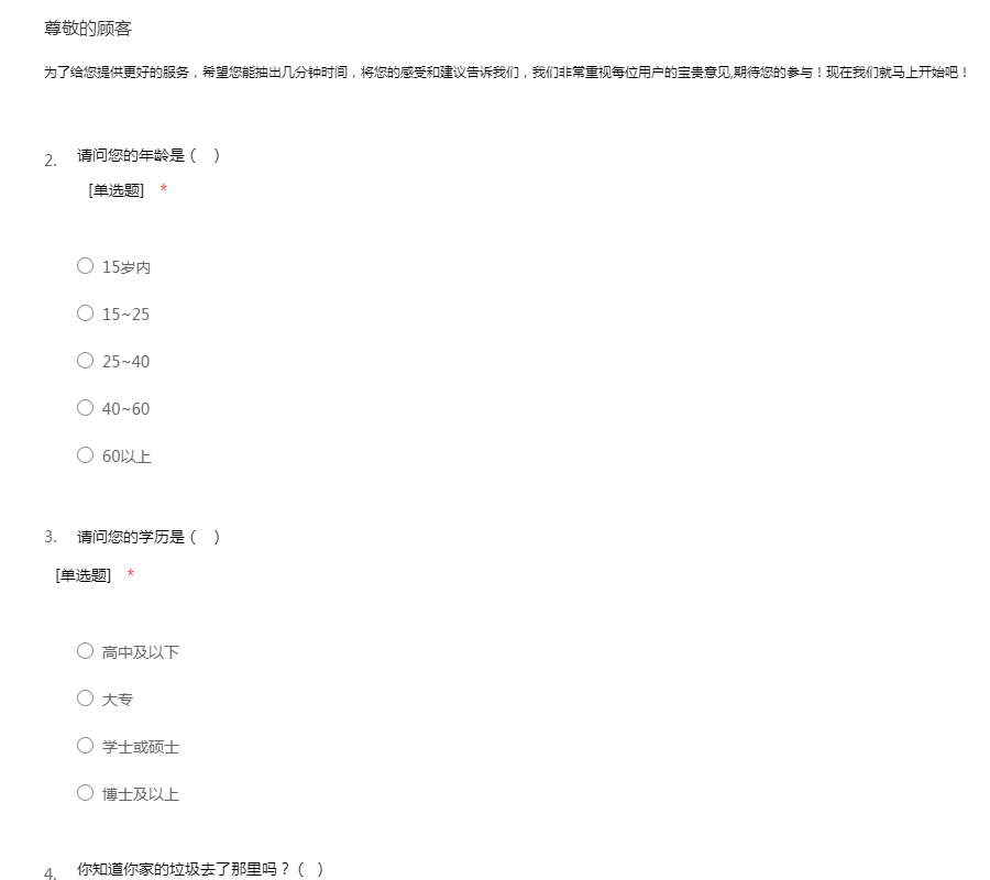 您好:为了更好的了解当前我们社区环境的一个整体状况,现在我们在做一个关于社区环境的调查活动。 希望您能抽出一点时间帮助我们完成这份问卷调查。谢谢您的合作!