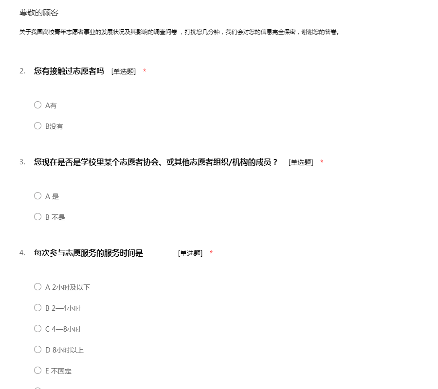 关于我国高校青年志愿者事业的发展状况及其影响的调查问卷 ,打扰您几分钟,我们会对您的信息完全保密,谢谢您的答卷。