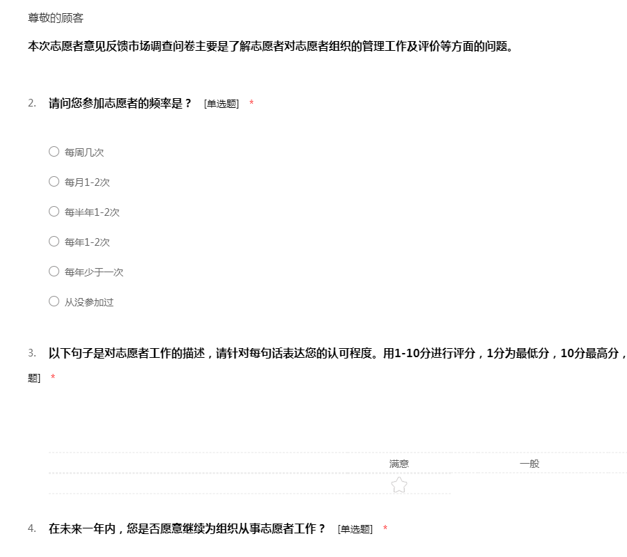 本次志愿者意见反馈市场调查问卷主要是了解志愿者对志愿者组织的管理工作及评价等方面的问题。