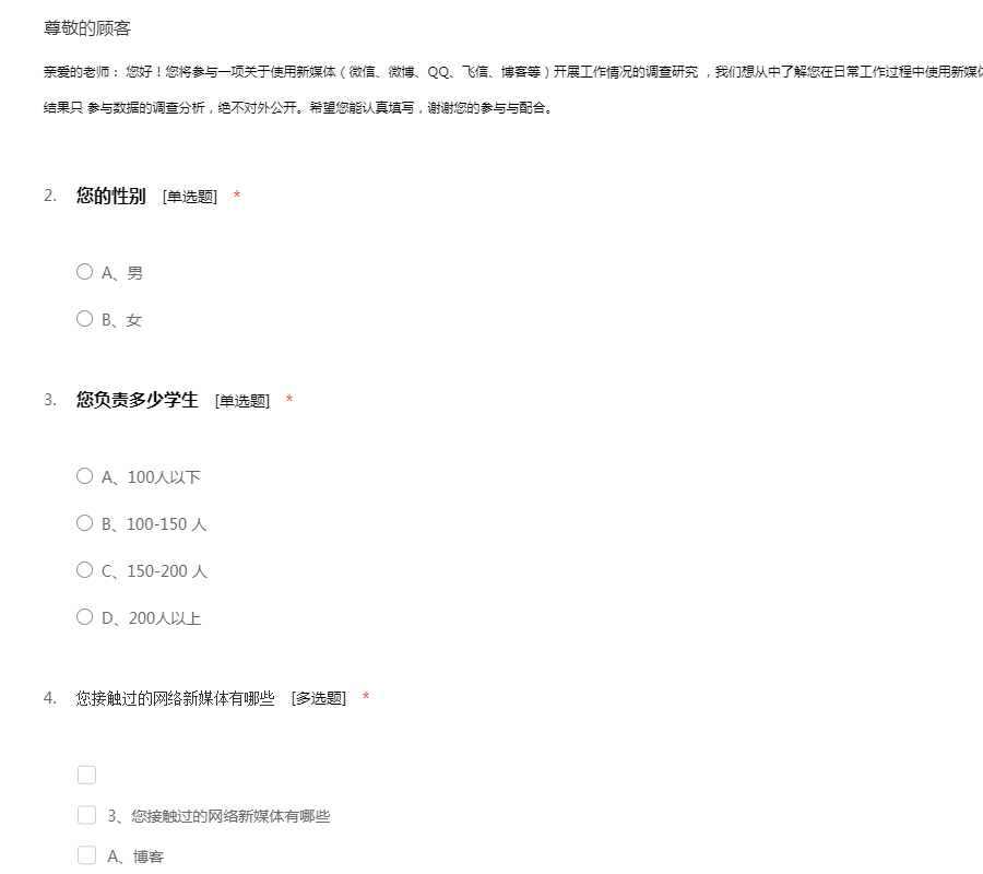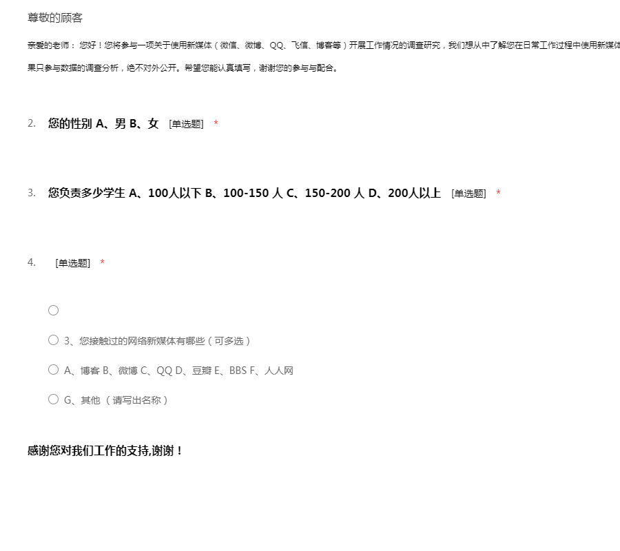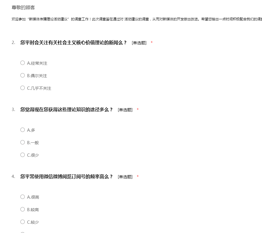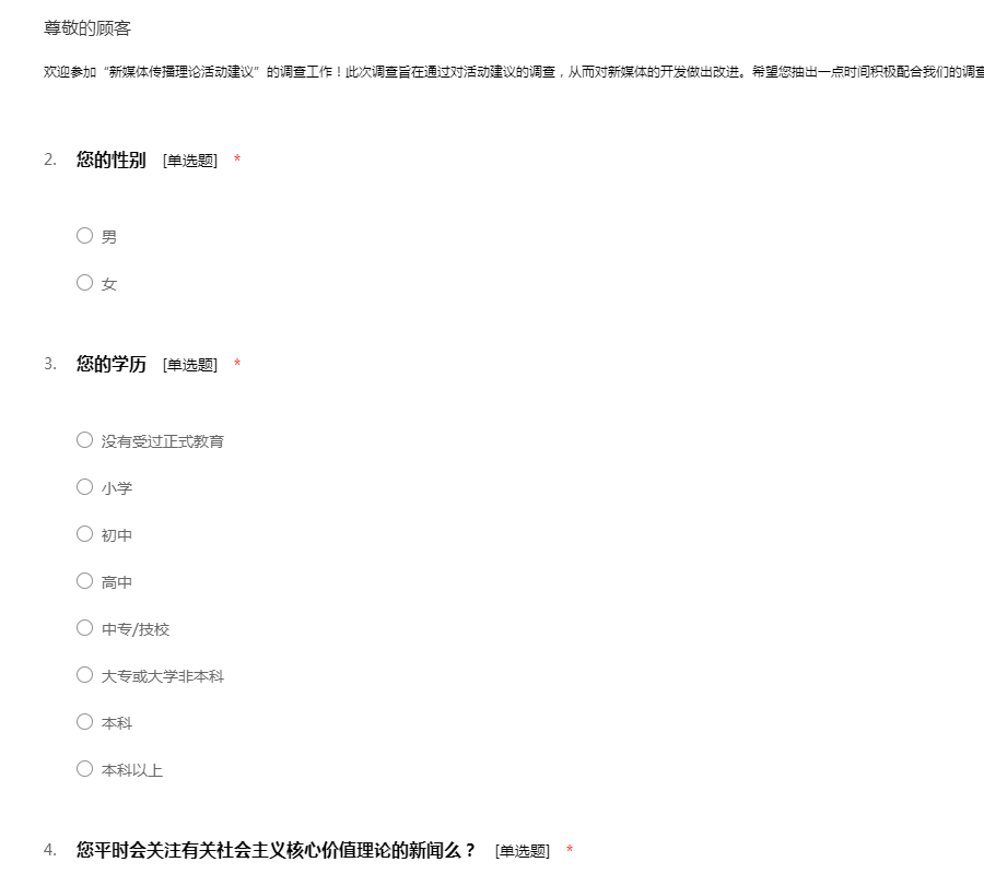 您的意见对我们非常重要,请认真填写,谢谢舆情是“舆论情况”的简称,是指在一定的社会空间内,围绕中介性社会事件的发生、发展和变化,作为主体的民众对作为客体的社会管理者、企业、个人及其他各类组织及其政治、社会、道德等方面的取向产生和持有的社会态度。互联网的诞生深刻地改变着人们信息交流与沟通的方式,为了解近年来舆论传播的基本规律及步骤,本小组特制作此份问卷。感谢您肯花时间和精力来帮助我们完成本次问卷调查!您的如实回答和宝贵意见将帮助我们深入了解网络舆论传播和引导的基本情况,对本项课题至关重要。此次问卷所有回答和数据将依据国家统计法严格保密,以保护您的个人隐私,请放心作答,非常感谢您的参与。!