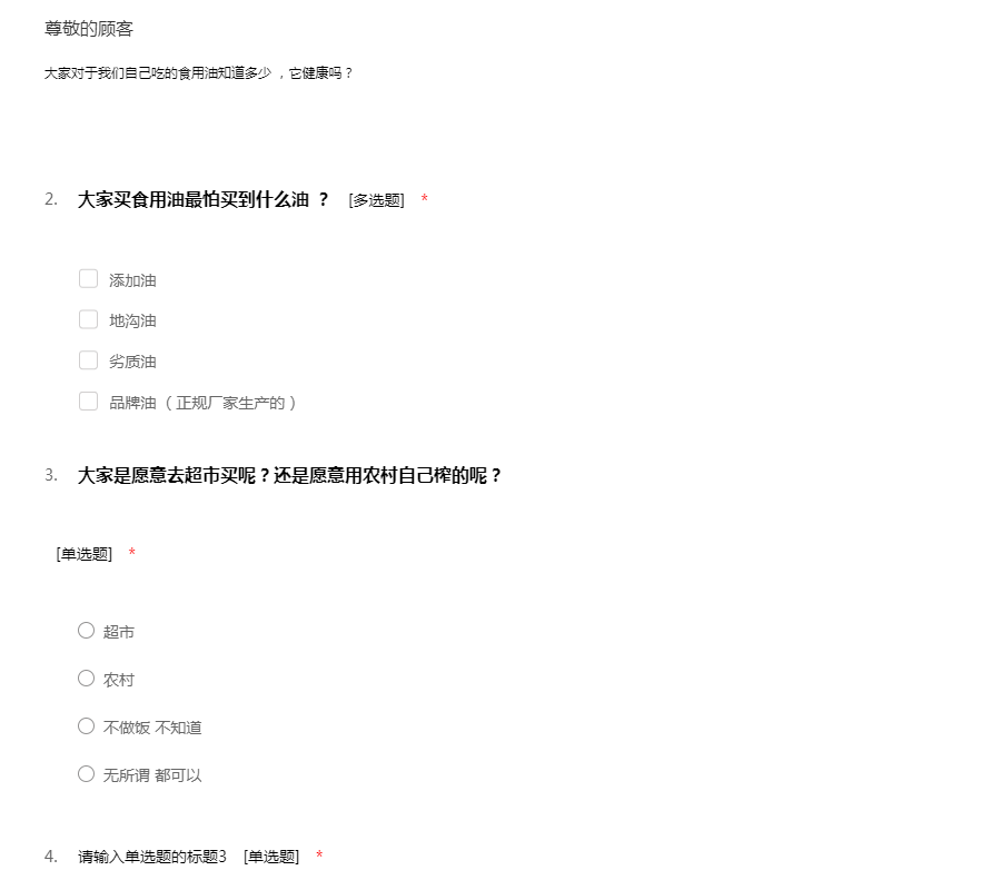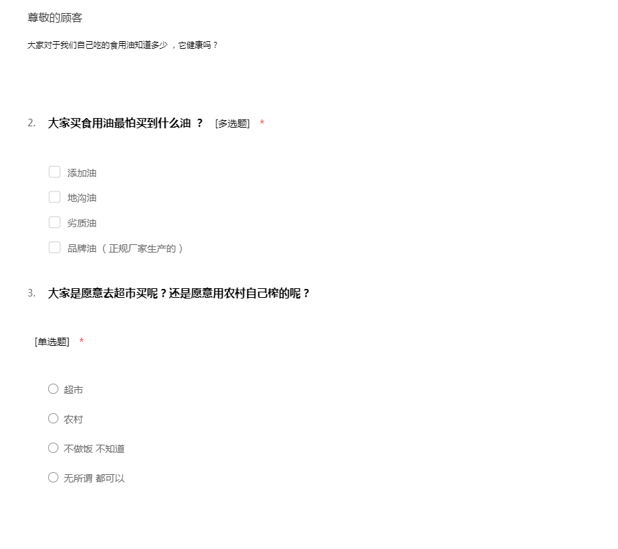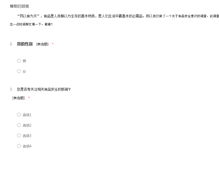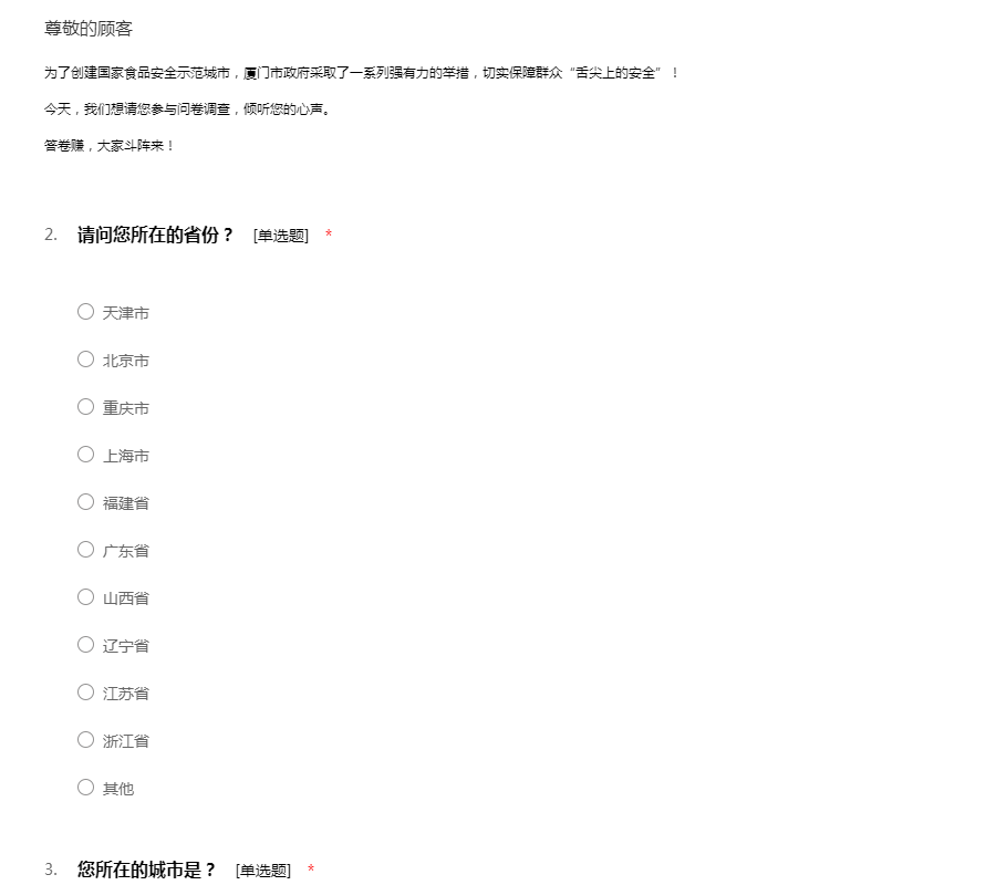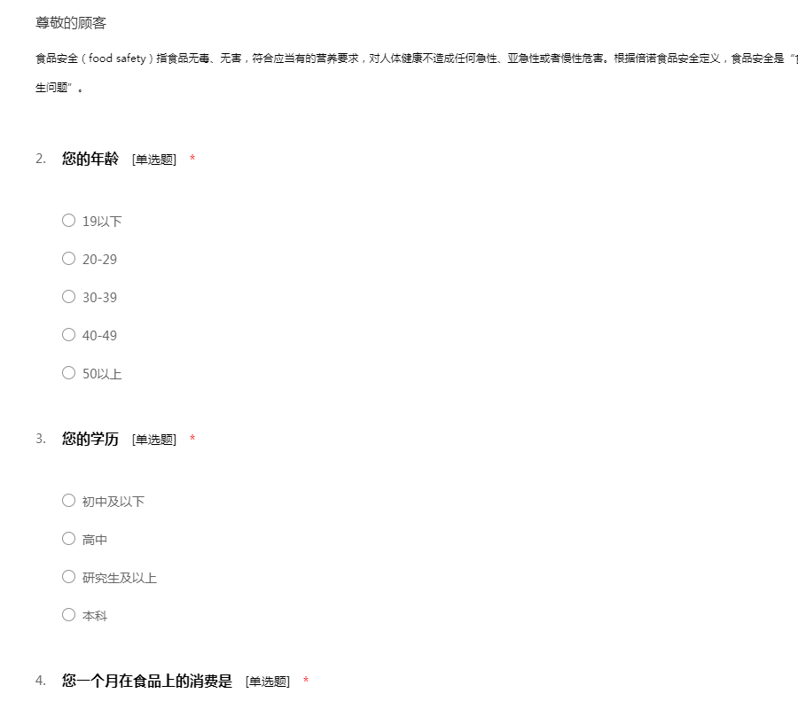 “民以食为天”,食品是人类赖以为生存的基本物质,是人们生活中最基本的必需品。所以我们做了一个关于食品安全意识的调查,此调查不涉及个人隐私问题,请您能在百忙之中抽出一点时间帮忙填一下,谢谢!