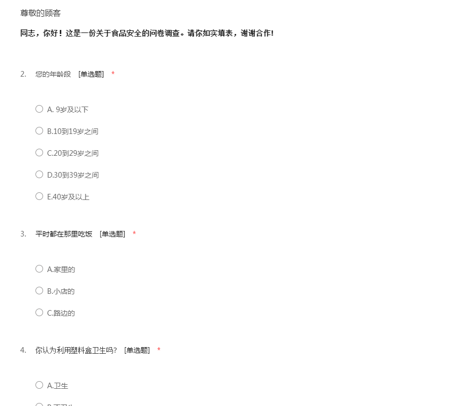您好,我们是济宁医学院的学生,我们要做一个关于食品安全问题的调查,此调查不涉及个人隐私问题,请您能在百忙之中抽出一点时间帮忙填一下,谢谢啦!