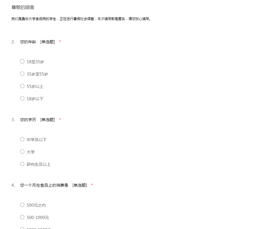 我们是鲁东大学食品院的学生,正在进行暑假社会调查,本次填写都是匿名,请您放心填写。