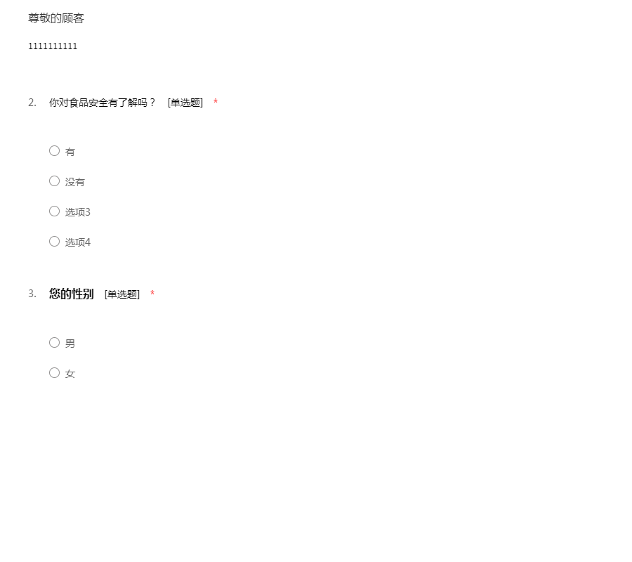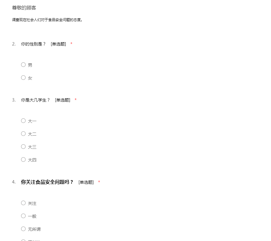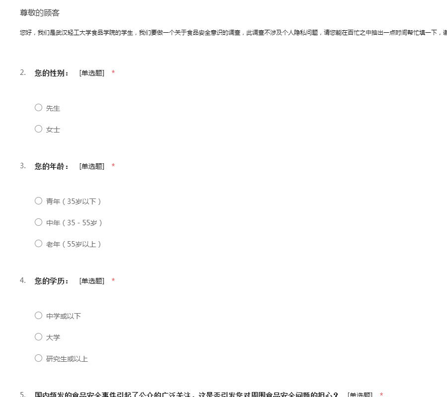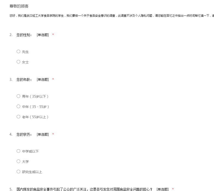 您好,我们是武汉轻工大学食品学院的学生,我们要做一个关于食品安全意识的调查,此调查不涉及个人隐私问题,请您能在百忙之中抽出一点时间帮忙填一下,谢谢啦!