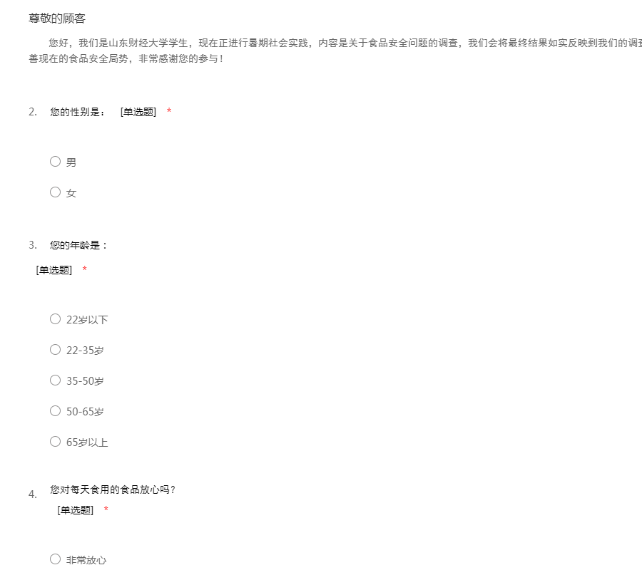 您好,我们是山东财经大学学生,现在正进行暑期社会实践,内容是关于食品安全问题的调查,我们会将最终结果如实反映到我们的调查论文中,并提出相应建议,希望能够改善现在的食品安全局势,非常感谢您的参与!