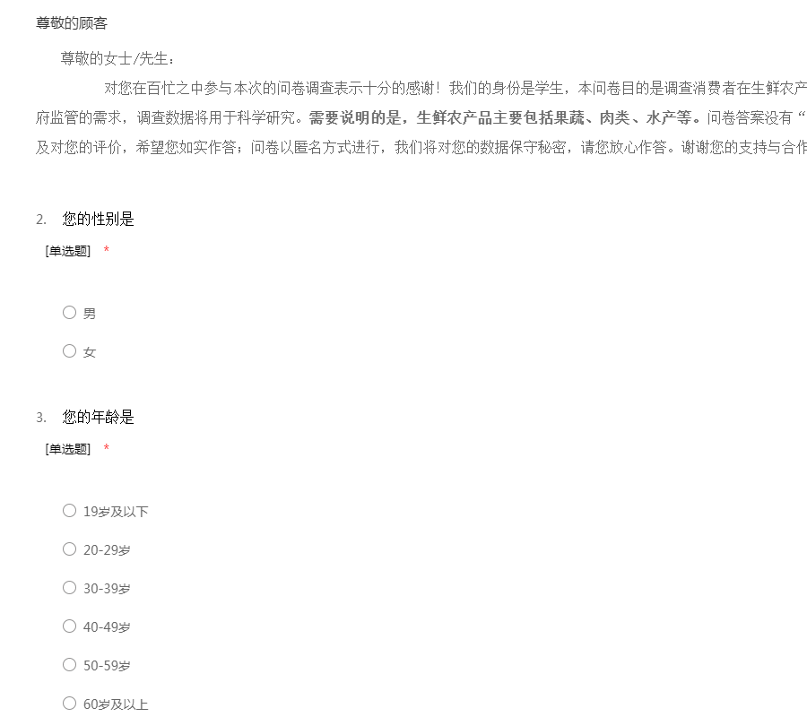 尊敬的女士/先生: 对您在百忙之中参与本次的问卷调查表示十分的感谢!我们的身份是学生,本问卷目的是调查消费者在生鲜农产品零售业态演变下的行为,以及对政府监管的需求,调查数据将用于科学研究。需要说明的是,生鲜农产品主要包括果蔬、肉类、水产等。问卷答案没有“好、坏”与“对、错”之分,也不涉及对您的评价,希望您如实作答;问卷以匿名方式进行,我们将对您的数据保守秘密,请您放心作答。谢谢您的支持与合作!