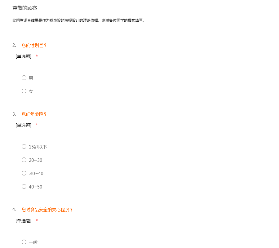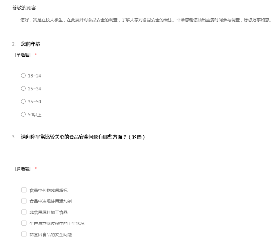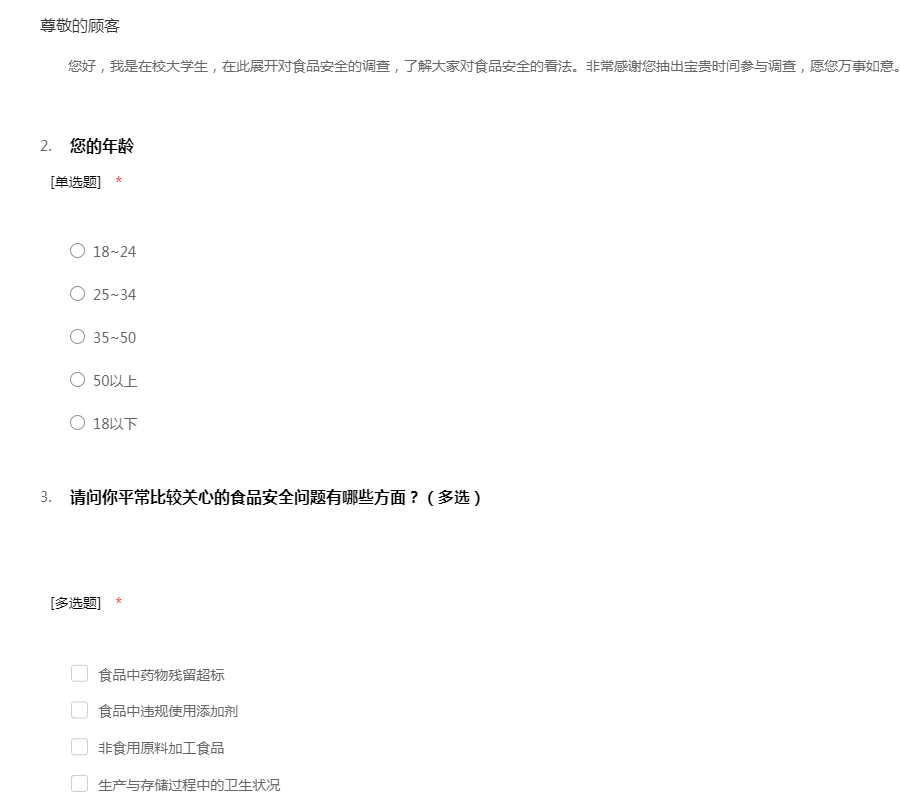 您好,我是在校大学生,在此展开对食品安全的调查,了解大家对食品安全的看法。非常感谢您抽出宝贵时间参与调查,愿您万事如意。