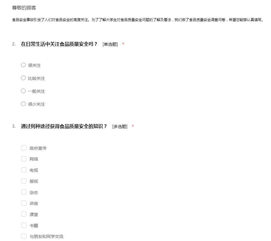 食品安全事故引发了人们对食品安全的高度关注。为了了解大学生对食品质量安全问题的了解及看法,我们做了食品质量安全调查问卷,希望您能够认真填写。