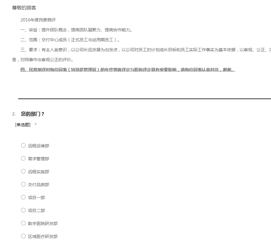 2017年度民意测评 一、宗旨:提升团队概念,提高团队凝聚力、提高协作能力。 二、范围:医疗卫生事业二部&行业研发中心。 三、要求:有主人翁意识,以公司长远发展为出发点,以公司对员工的计划成长目标和员工实际工作事实为基本依据,以客观、公正、沟通、公开、规范为核心的理念,实事求是,对同事作出客观公正的评价。 四、民意测评的结果将作为员工评定的参考依据,请每位同事认真对待、客观评价,谢谢。