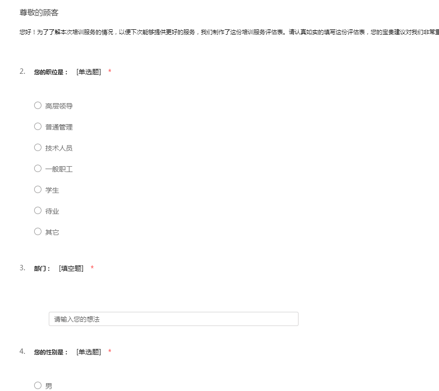 您好!为了了解本次培训服务的情况,以便下次能够提供更好的服务,我们制作了这份培训服务评估表。请认真如实的填写这份评估表,您的宝贵建议对我们非常重要。感谢您的支持!