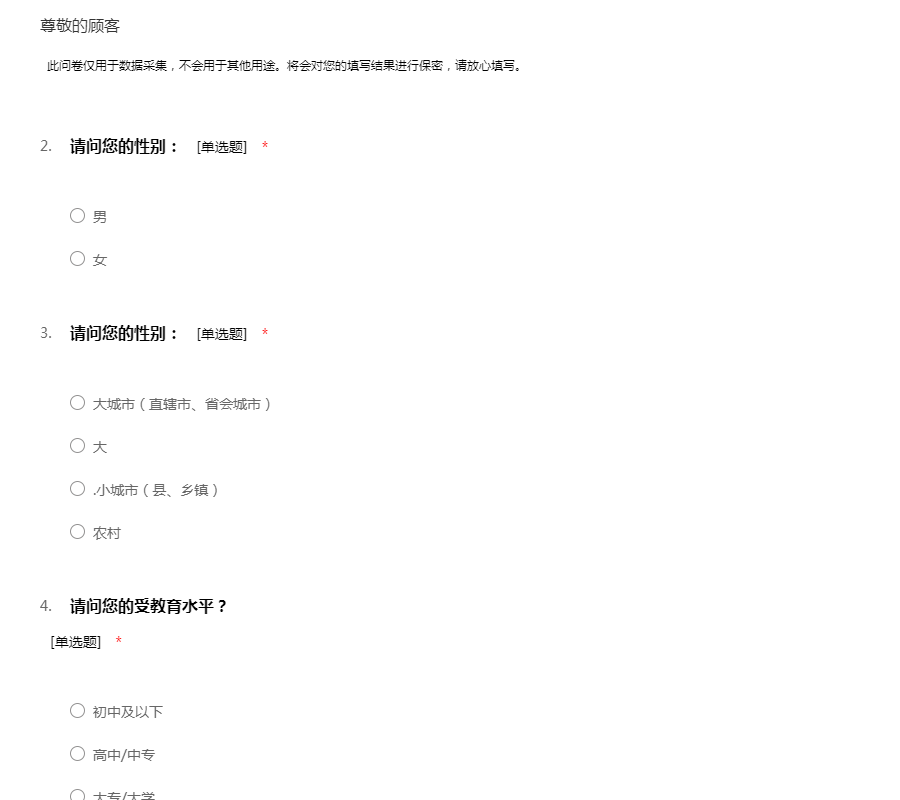 此问卷仅用于数据采集,不会用于其他用途。将会对您的填写结果进行保密,请放心填写。