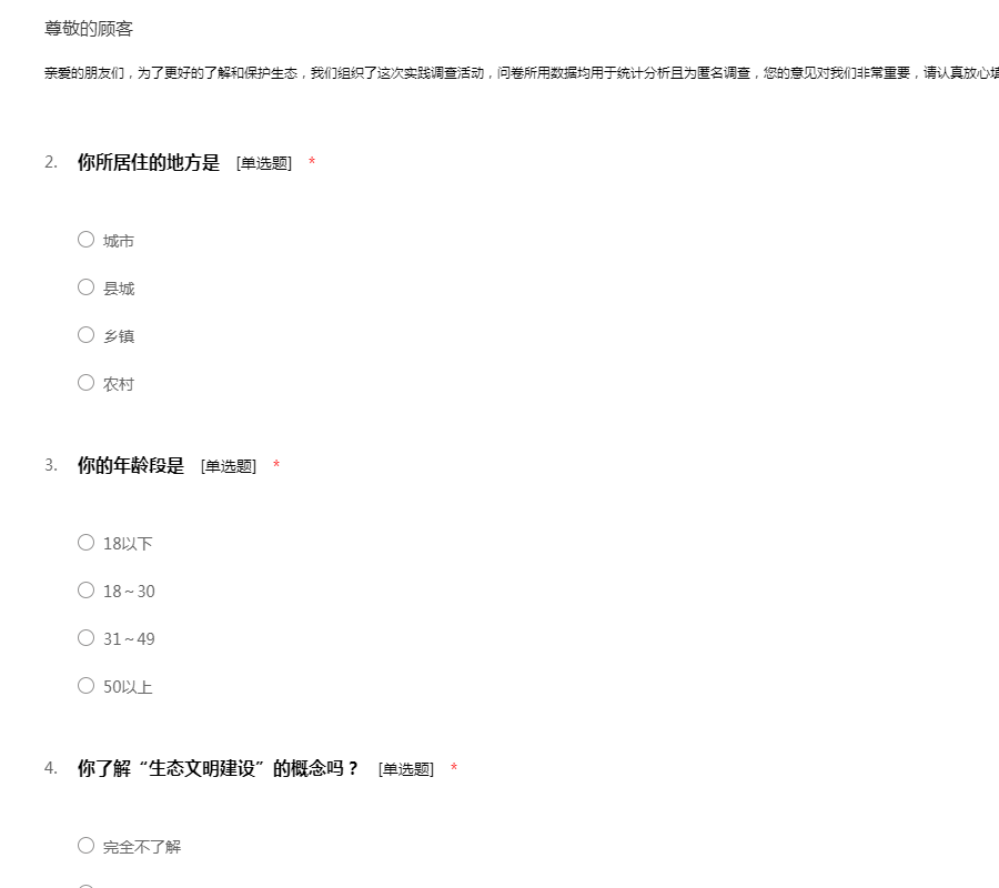 亲爱的朋友们,为了更好的了解和保护生态,我们组织了这次实践调查活动,问卷所用数据均用于统计分析且为匿名调查,您的意见对我们非常重要,请认真放心填写,谢谢!