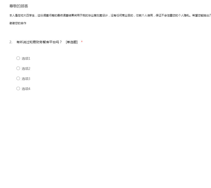 本人是在校大四学生,这份调查问卷的最终调查结果将用于我的毕业策划案设计,没有任何商业目的,仅就个人使用,保证不会泄露您的个人隐私。希望您能抽出几分钟时间帮忙填写我的问卷,此问卷不用署名,谢谢您的合作
