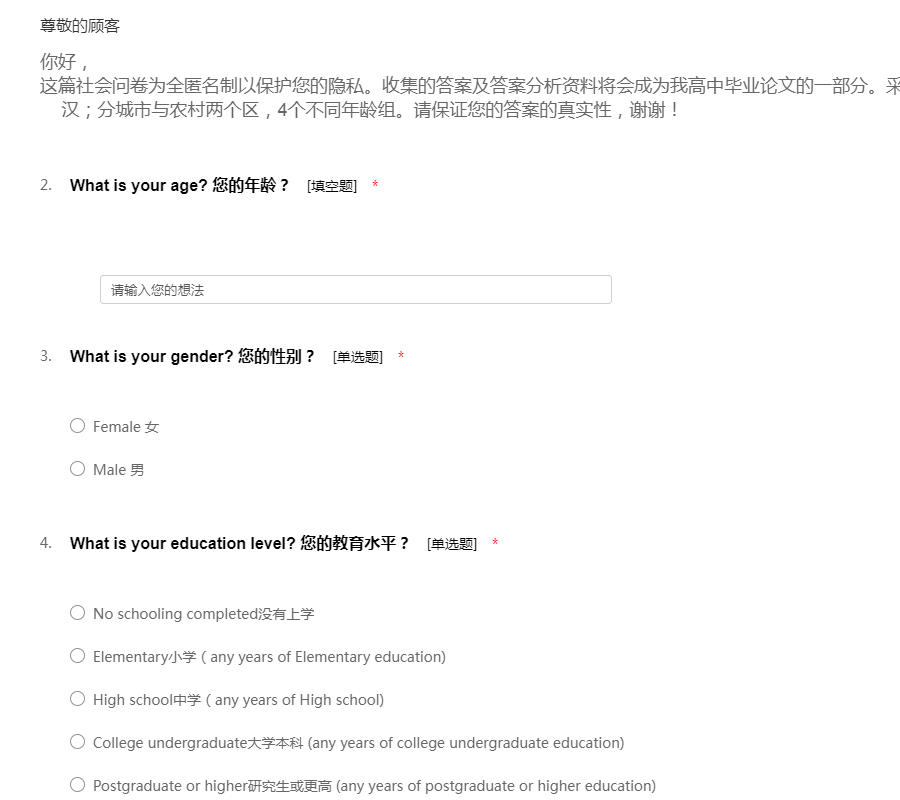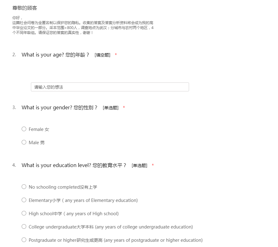 你好, 这篇社会问卷为全匿名制以保护您的隐私。收集的答案及答案分析资料将会成为我高中毕业论文的一部分。采本范围>800人,调查地点为武汉;分城市与农村两个区,4个不同年龄组。请保证您的答案的真实性,谢谢!
