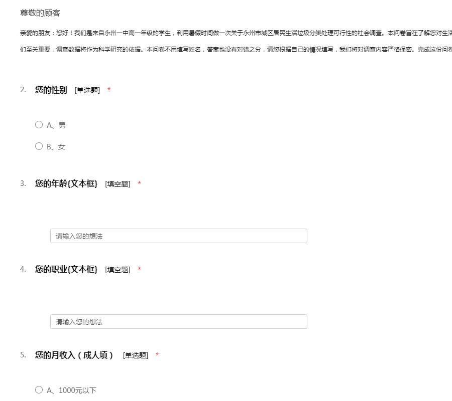亲爱的朋友:您好!我们是来自永州一中高一年级的学生,利用暑假时间做一次关于永州市城区居民生活垃圾分类处理可行性的社会调查。本问卷旨在了解您对生活垃圾分类处理方案的意见与看法,您的回答对我们至关重要,调查数据将作为科学研究的依据。本问卷不用填写姓名,答案也没有对错之分,请您根据自己的情况填写,我们将对调查内容严格保密。完成这份问卷大约需要花费您几分钟的时间,谢谢您的合作!