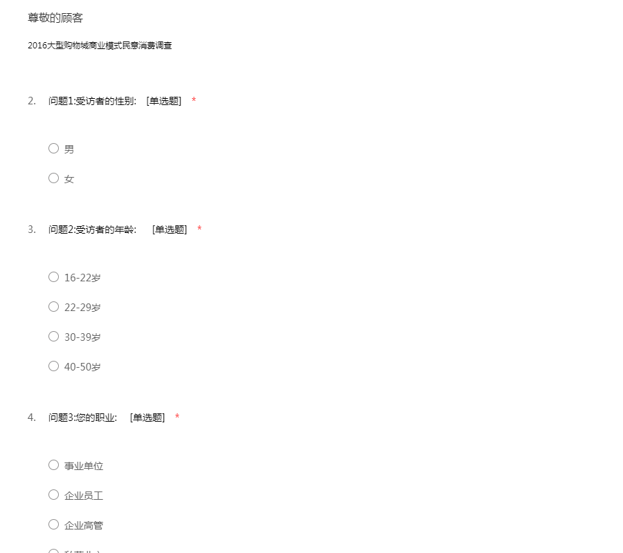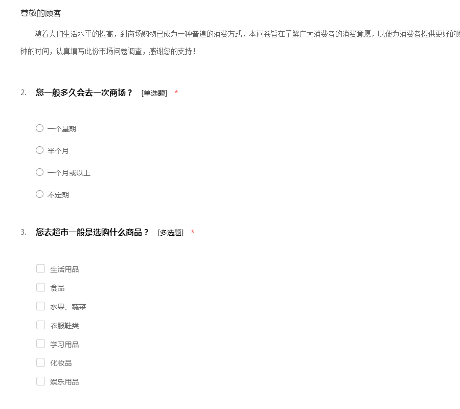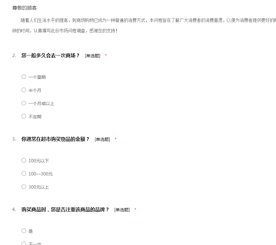 随着人们生活水平的提高,到商场购物已成为一种普遍的消费方式,本问卷旨在了解广大消费者的消费意愿,以便为消费者提供更好的购物环境以及服务。希望您能花费两三分钟的时间,认真填写此份市场问卷调查,感谢您的支持!
