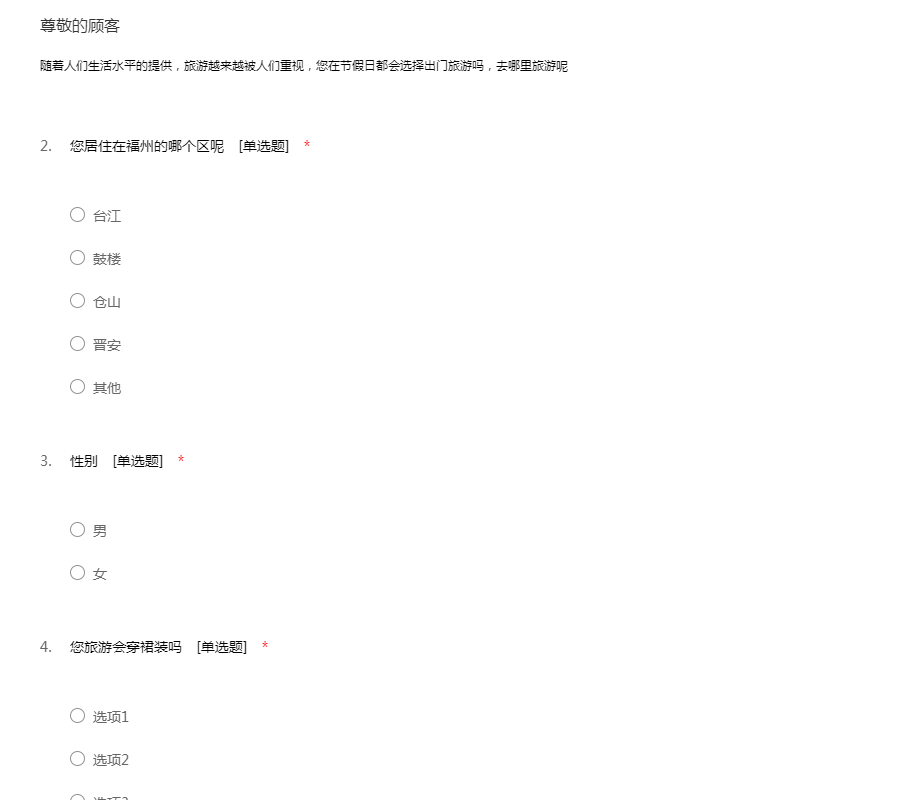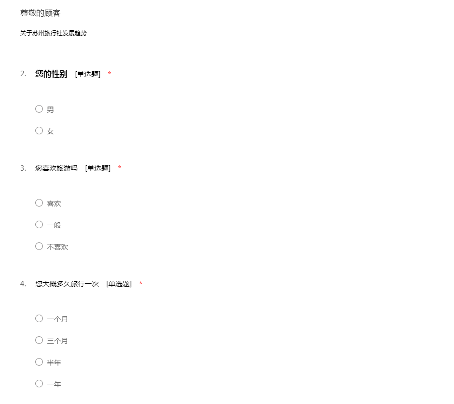 亲爱的受访者您好!这份问卷是针对旅游需求进行的调研,不涉及隐私,可能需要您花几分钟的时间填写,感谢您的配合和参与。