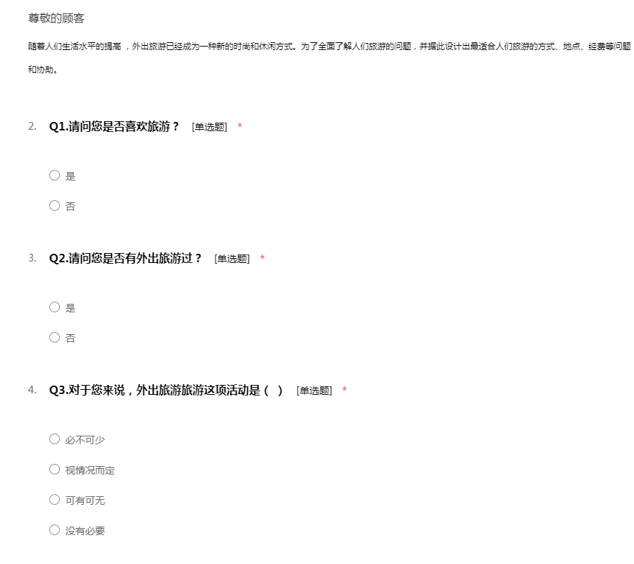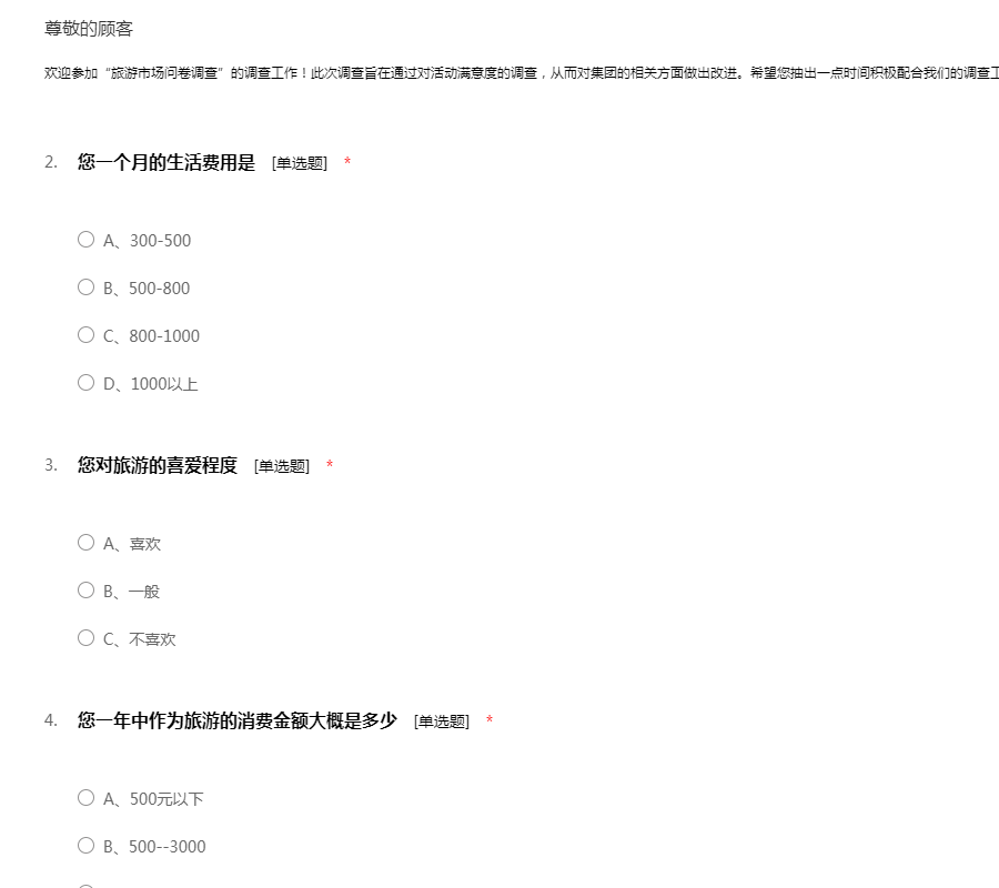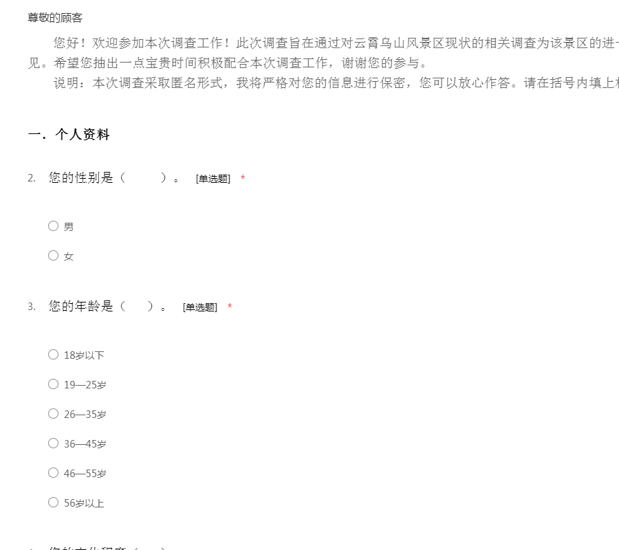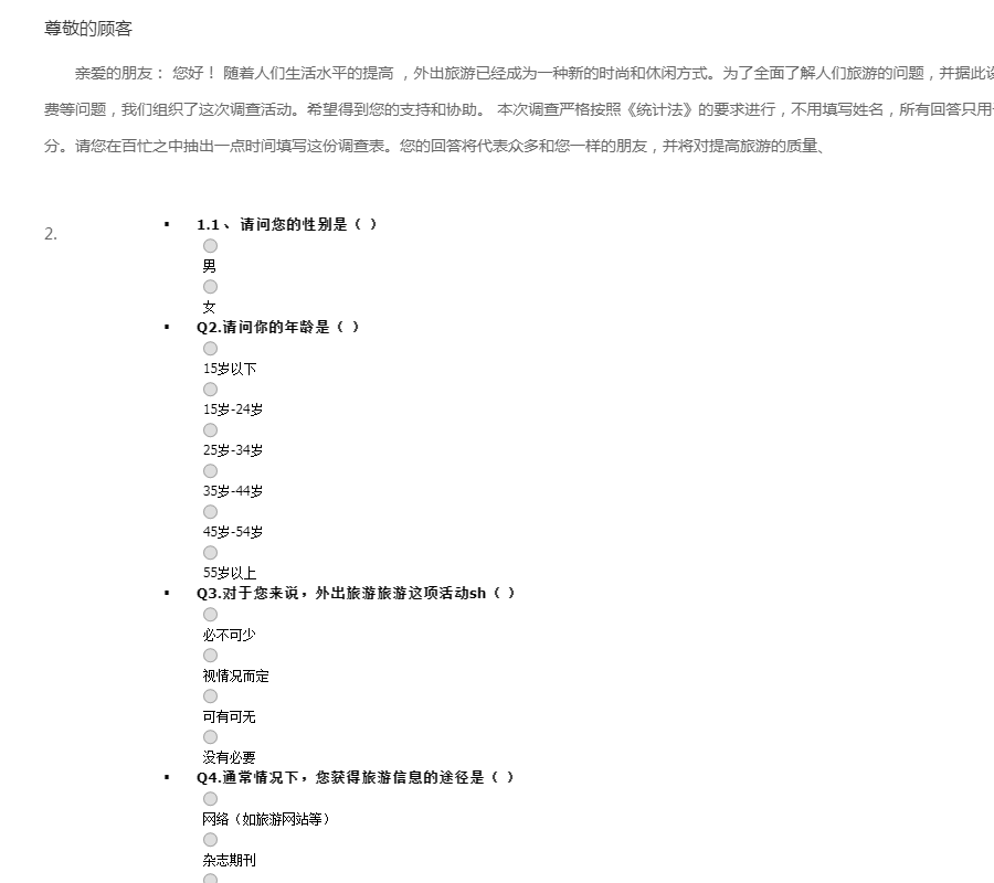 亲爱的朋友: 您好! 随着人们生活水平的提高 ,外出旅游已经成为一种新的时尚和休闲方式。为了全面了解人们旅游的问题,并据此设计出最适合人们旅游的方式、地点、经费等问题,我们组织了这次调查活动。希望得到您的支持和协助。 本次调查严格按照《统计法》的要求进行,不用填写姓名,所有回答只用于统计分析,各种答案没有正确、错误之分。请您在百忙之中抽出一点时间填写这份调查表。您的回答将代表众多和您一样的朋友,并将对提高旅游的质量、服务水平提供帮助。