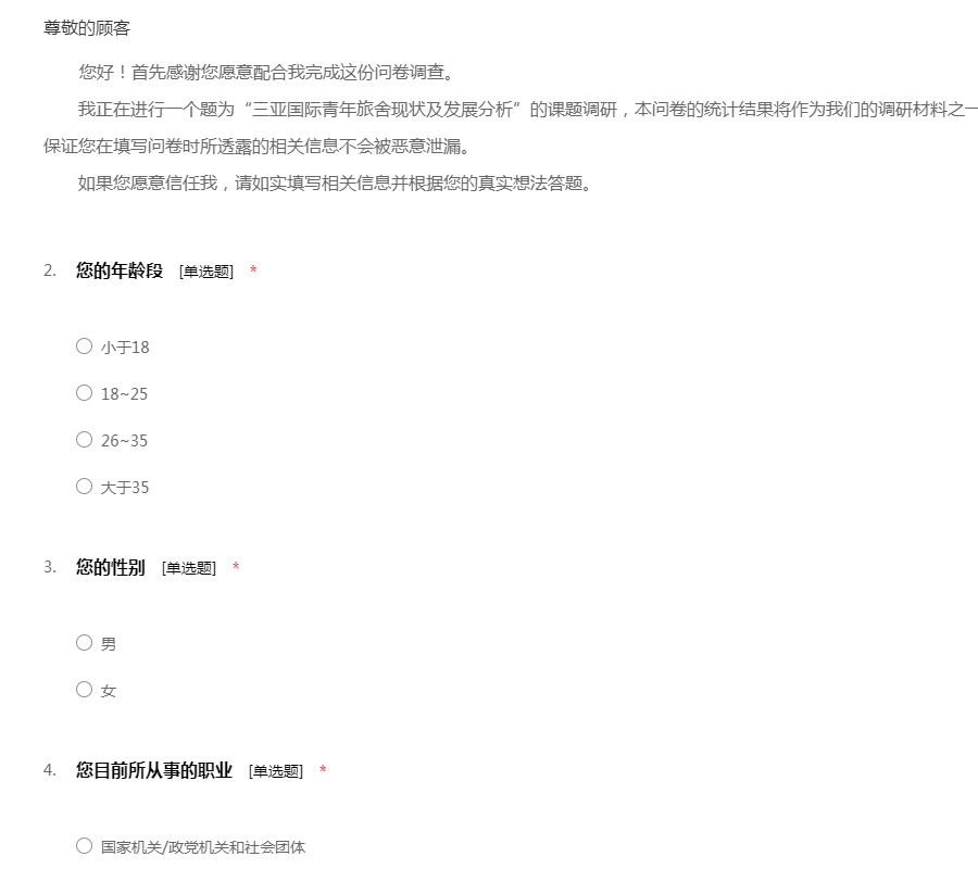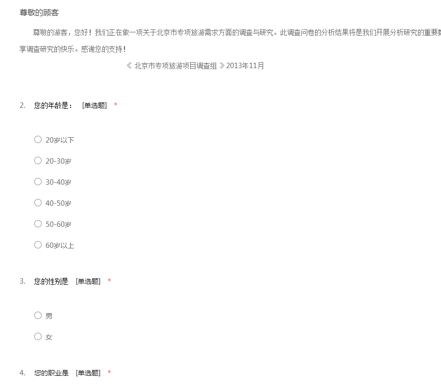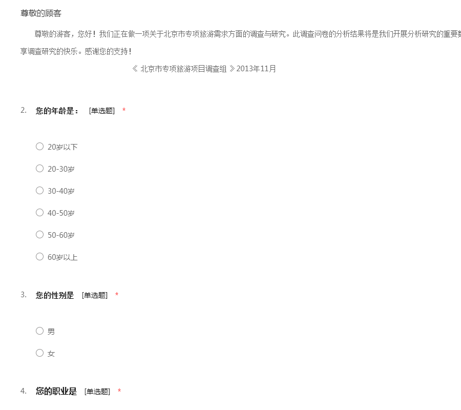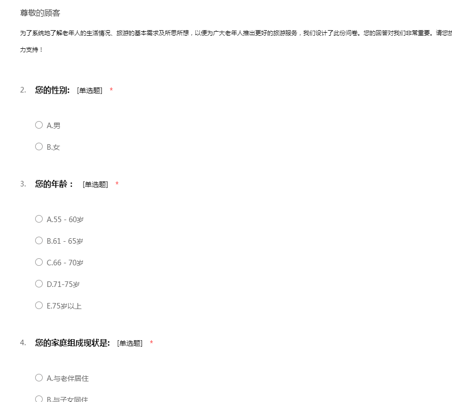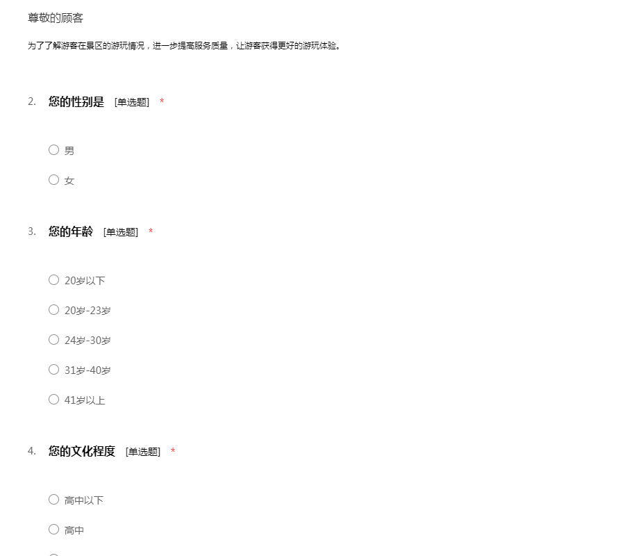 亲爱的朋友: 您好! 随着人们生活水平的提高 ,外出旅游已经成为一种新的时尚和休闲方式。为了全面了解人们旅游的问题,并据此设计出最适合人们旅游的方式、地点、经费等问题,我们组织了这次调查活动。希望得到您的支持和协助。 本次调查严格按照《统计法》的要求进行,不用填写姓名,所有回答只用于统计分析,各种答案没有正确、错误之分。请您在百忙之中抽出一点时间填写这份调查表。您的回答将代表众多和您一样的朋友,并将对提高旅游的质量、服务水平提供帮助。