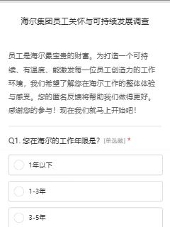 员工是海尔最宝贵的财富。为打造一个可持续、有温度、能激发每一位员工创造力的工作环境,我们希望了解您在海尔工作的整体体验与感受。您的匿名反馈将帮助我们做得更好。感谢您的参与!现在我们就马上开始吧!
