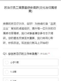 亲爱的苏泊尔伙伴,您好!为持续打造“品质立业”背后的卓越组织,提升每一位伙伴的归属感与幸福感,我们诚挚邀请您参与本次调研。您的匿名反馈至关重要,我们将用心聆听,积极改进。现在我们就马上开始吧!