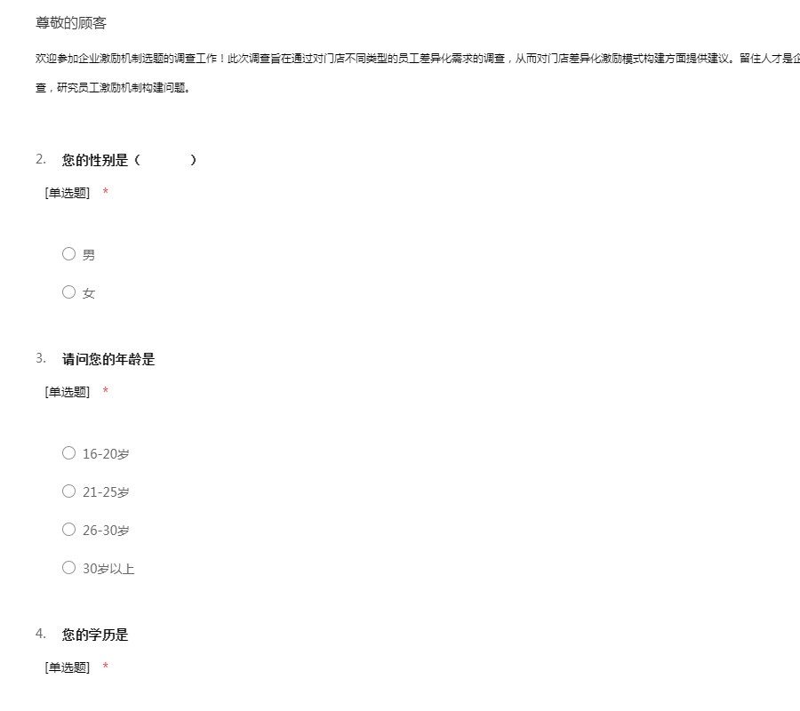 欢迎参加企业激励机制选题的调查工作!此次调查旨在通过对门店不同类型的员工差异化需求的调查,从而对门店差异化激励模式构建方面提供建议。留住人才是企业发展的根本保证;通过对企业门店工的问卷调查,研究员工激励机制构建问题。