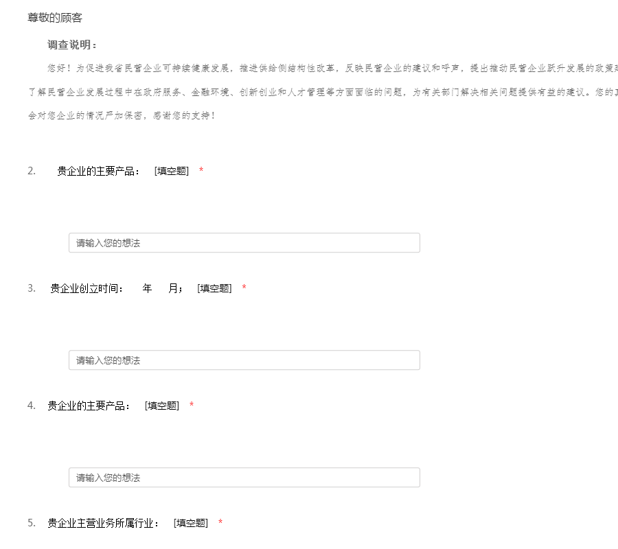 调查说明: 您好!为促进我省民营企业可持续健康发展,推进供给侧结构性改革,反映民营企业的建议和呼声,提出推动民营企业跃升发展的政策建议。我们特别设计此问卷进行调查,以了解民营企业发展过程中在政府服务、金融环境、创新创业和人才管理等方面面临的问题,为有关部门解决相关问题提供有益的建议。您的真实情况和看法,对我们十分重要,我们会对您企业的情况严加保密,感谢您的支持!