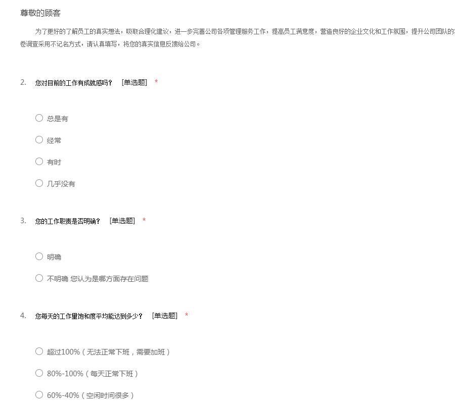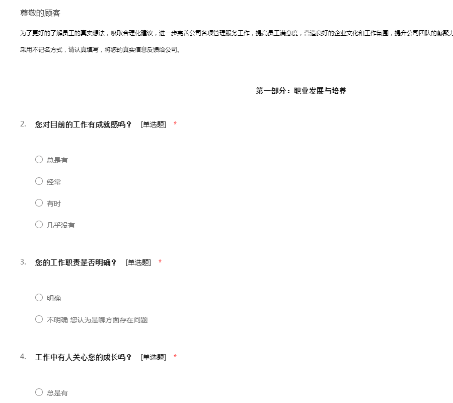 亲爱的员工,您好!为了了解公司的管理、工作环境、福利待遇等各方面对您的工作影响,以便公司能针对出现的问题和不足进行整改。本问卷无须填写姓名,所以请放心的如实填写。感谢您的配合!