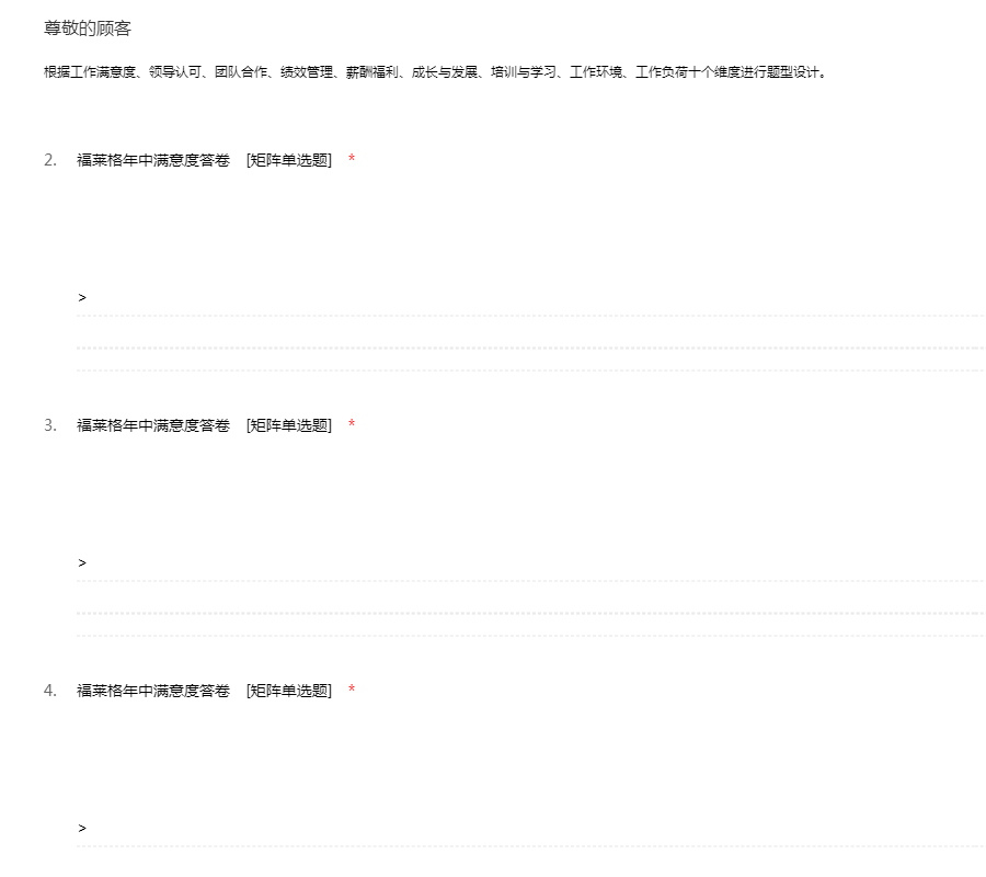 根据工作满意度、领导认可、团队合作、绩效管理、薪酬福利、成长与发展、培训与学习、工作环境、工作负荷十个维度进行题型设计。