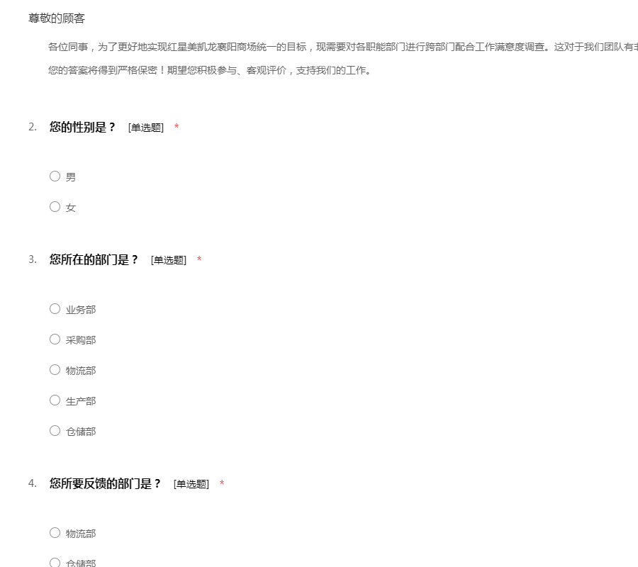 各位同事,为了更好地实现红星美凯龙襄阳商场统一的目标,现需要对各职能部门进行跨部门配合工作满意度调查。这对于我们团队有非常重要的价值! 您的答案将得到严格保密!期望您积极参与、客观评价,支持我们的工作。