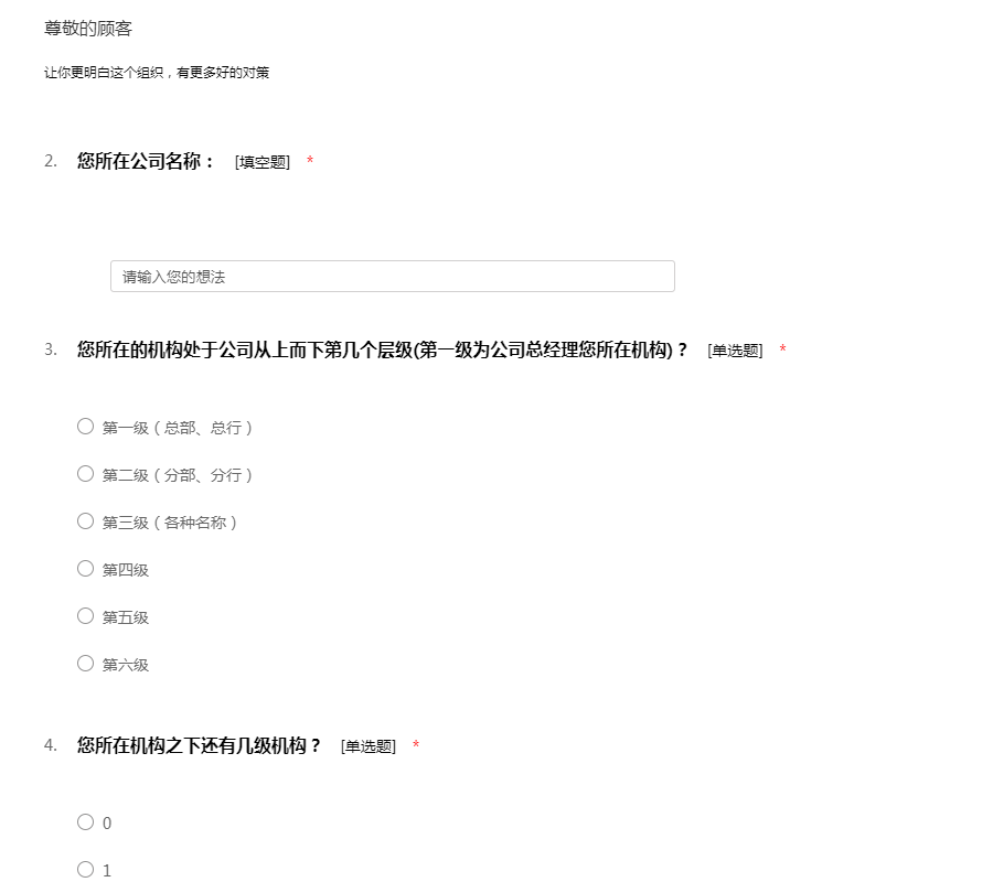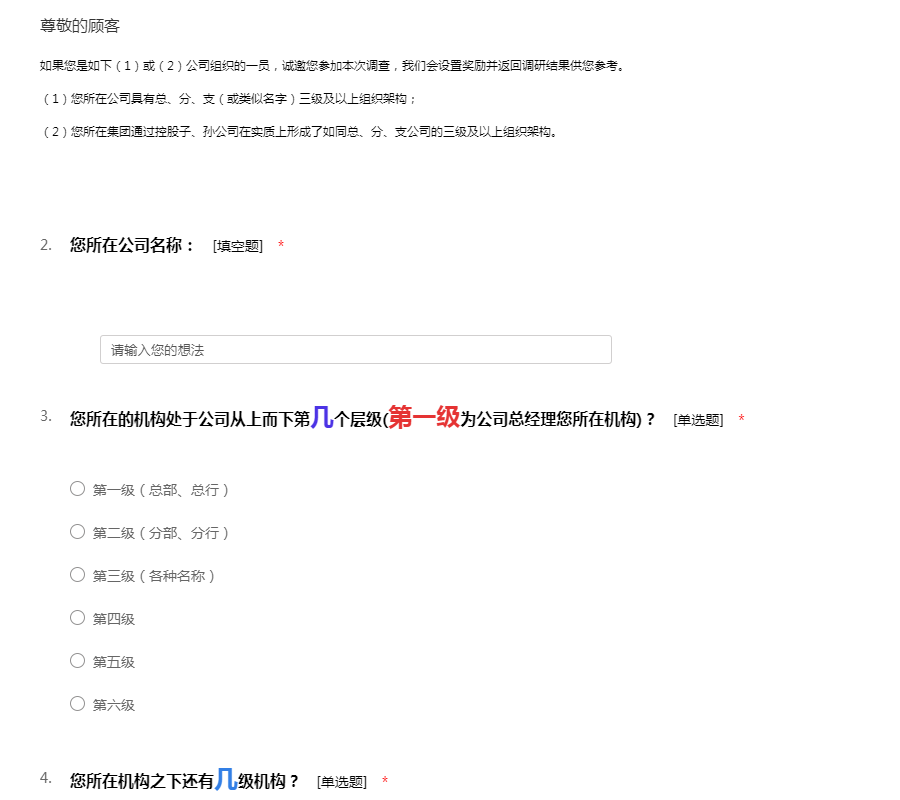 如果您是如下(1)或(2)公司组织的一员,诚邀您参加本次调查,我们会设置奖励并返回调研结果供您参考。 (1)您所在公司具有总、分、支(或类似名字)三级及以上组织架构; (2)您所在集团通过控股子、孙公司在实质上形成了如同总、分、支公司的三级及以上组织架构。