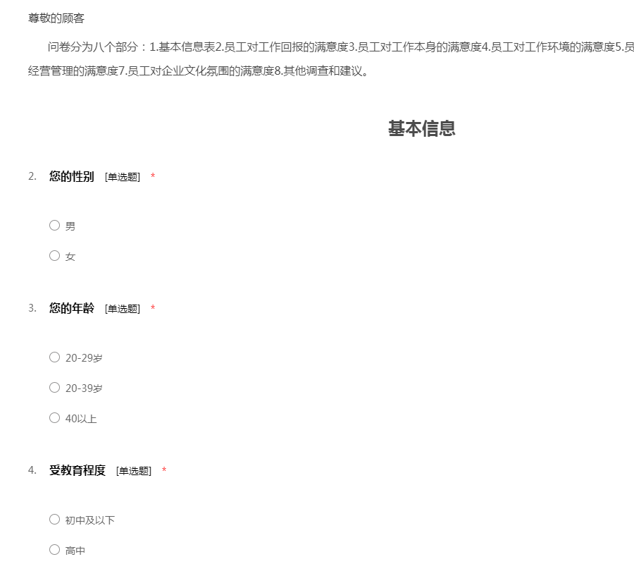 问卷分为八个部分:1.基本信息表2.员工对工作回报的满意度3.员工对工作本身的满意度4.员工对工作环境的满意度5.员工对直接主管的满意度6.员工对企业经营管理的满意度7.员工对企业文化氛围的满意度8.其他调查和建议。