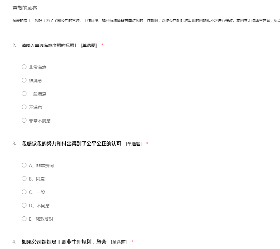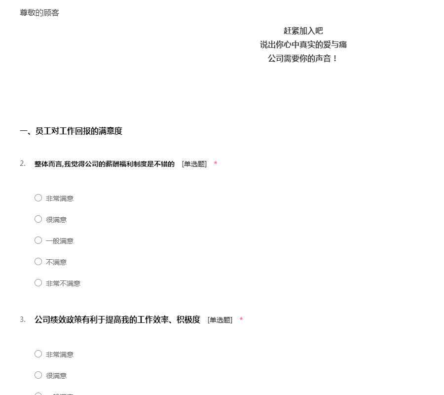 亲爱的员工,您好!为了了解公司的管理、工作环境、福利待遇等各方面对您的工作影响,以便公司能针对出现的问题和不足进行整改。本问卷无须填写姓名,所以请放心的如实填写。感谢您的配合!