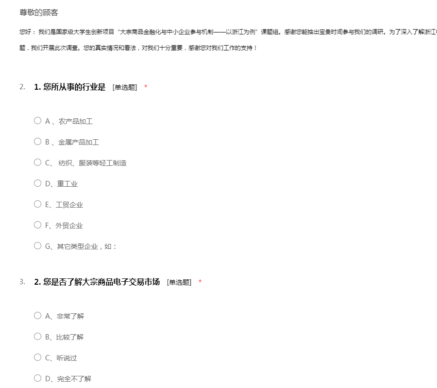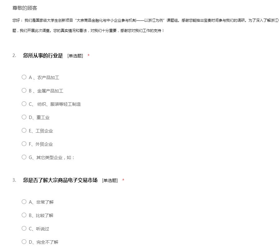 您好: 我们是国家级大学生创新项目“大宗商品金融化与中小企业参与机制——以浙江为例”课题组。感谢您能抽出宝贵时间参与我们的调研。为了深入了解浙江中小企业参与大宗商品交易的现状和存在的问题,我们开展此次调查。您的真实情况和看法,对我们十分重要,感谢您对我们工作的支持!