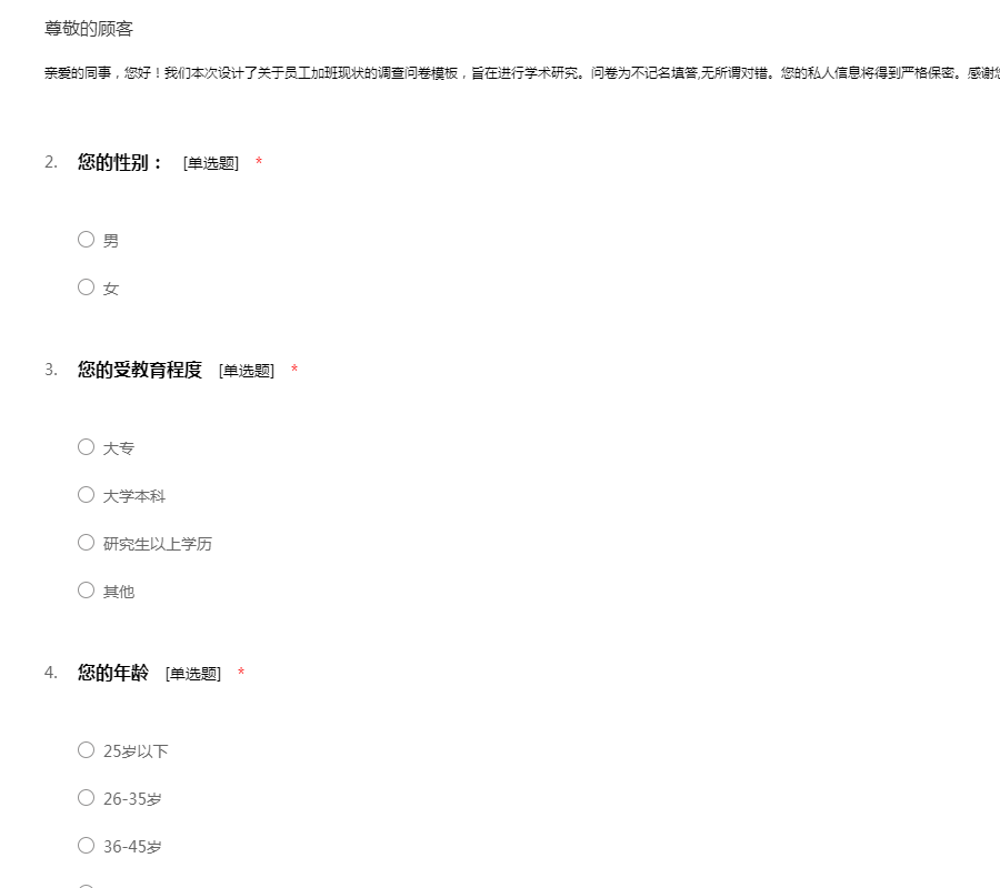 亲爱的同事,您好!我们本次设计了关于员工加班现状的调查问卷模板,旨在进行学术研究。问卷为不记名填答,无所谓对错。您的私人信息将得到严格保密。感谢您在百忙之中填答问卷!