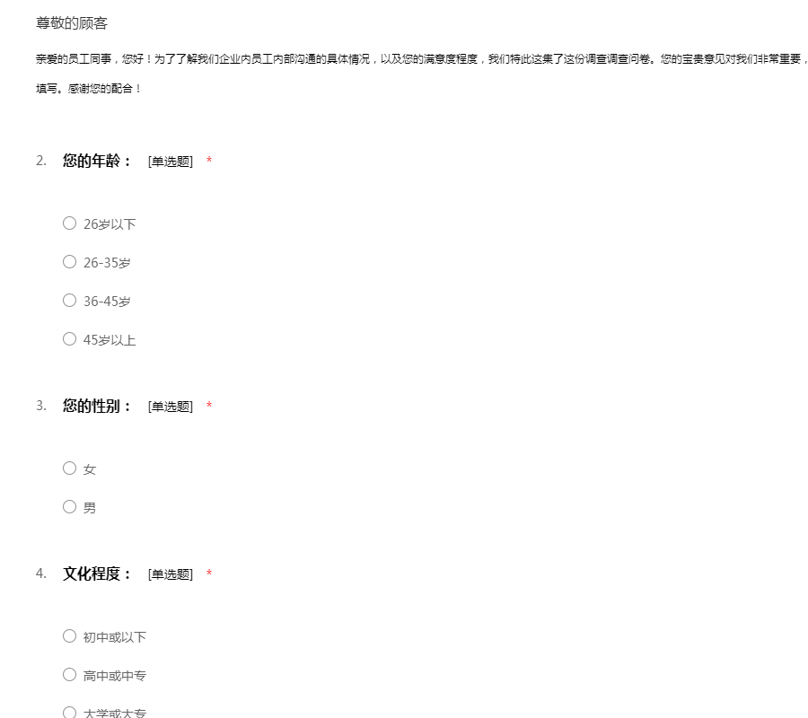 亲爱的员工同事,您好!为了了解我们企业内员工内部沟通的具体情况,以及您的满意度程度,我们特此这集了这份调查调查问卷。您的宝贵意见对我们非常重要,本问卷也是采用不记名方式,所以请放心的如实填写。感谢您的配合!