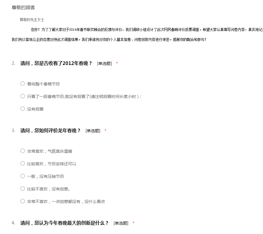 尊敬的先生女士 您好!为了了解大家对于2014年春节联欢晚会的反馈与评价,我们调研小组设计了此次网民春晚评价投票调查。希望大家认真填写问卷内容,真实地记录下自己的实际情况、发表个人的想法和意见,我们将以客观公正的态度对待此次调查结果。我们承诺将对你的个人基本信息、问卷回答内容进行保密。感谢你的配合和参与!