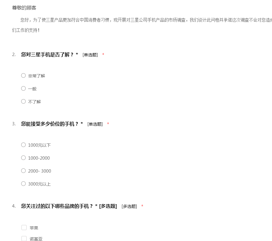 感谢您参与“三星手机市场调查问卷”,本次调查旨在了解消费者购买三星手机的市场份额,调查所得的结果对您的工作和生活不会带来任何不良影响,请您根据自己的实际情况放心填写,51调查网感谢您的配合!