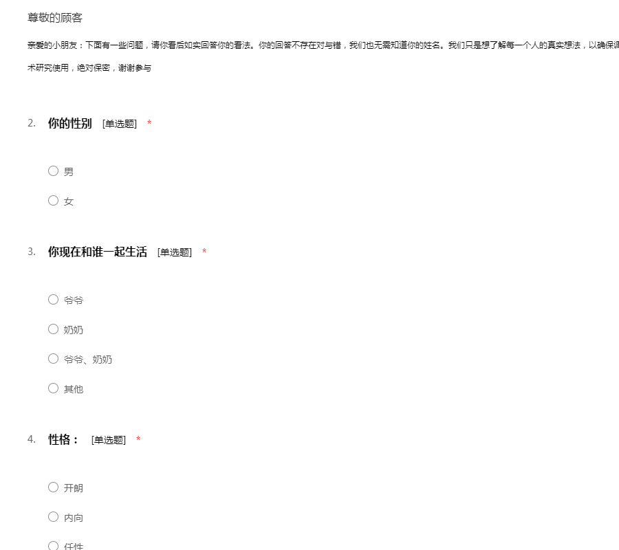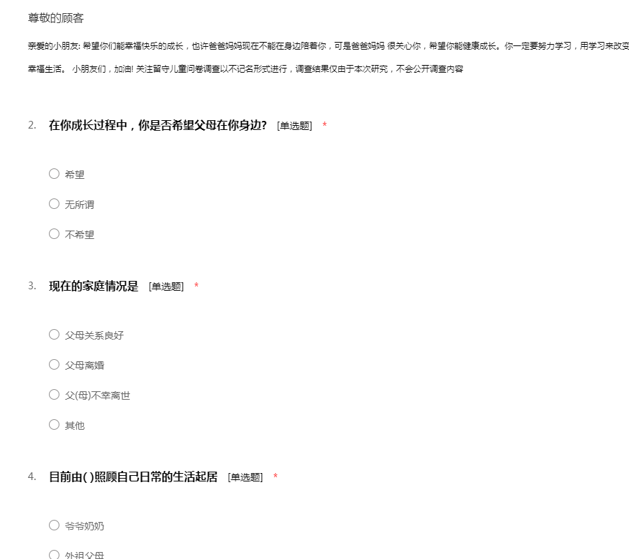 亲爱的小朋友:下面有一些问题,请你看后如实回答你的看法。你的回答不存在对与错,我们也无需知道你的姓名。我们只是想了解每一个人的真实想法,以确保调查的可靠性。关爱留守儿童问卷调查结果仅供学术研究使用,绝对保密,谢谢参与