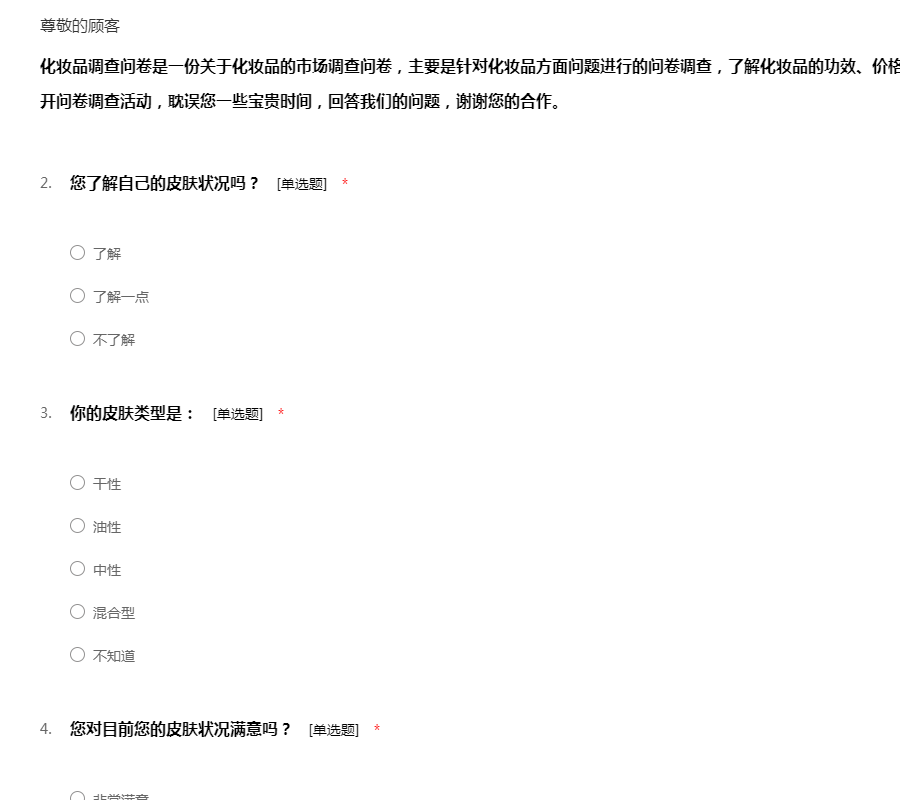 您好!我们此次设计的是一份有关化妆品的市场调查问卷,为了解化妆品市场的具体情况。此次问卷为匿名填写,所有信息不会对外公开,所以请放心的实际情况如实填写。感谢您对我们此次问卷的参与!